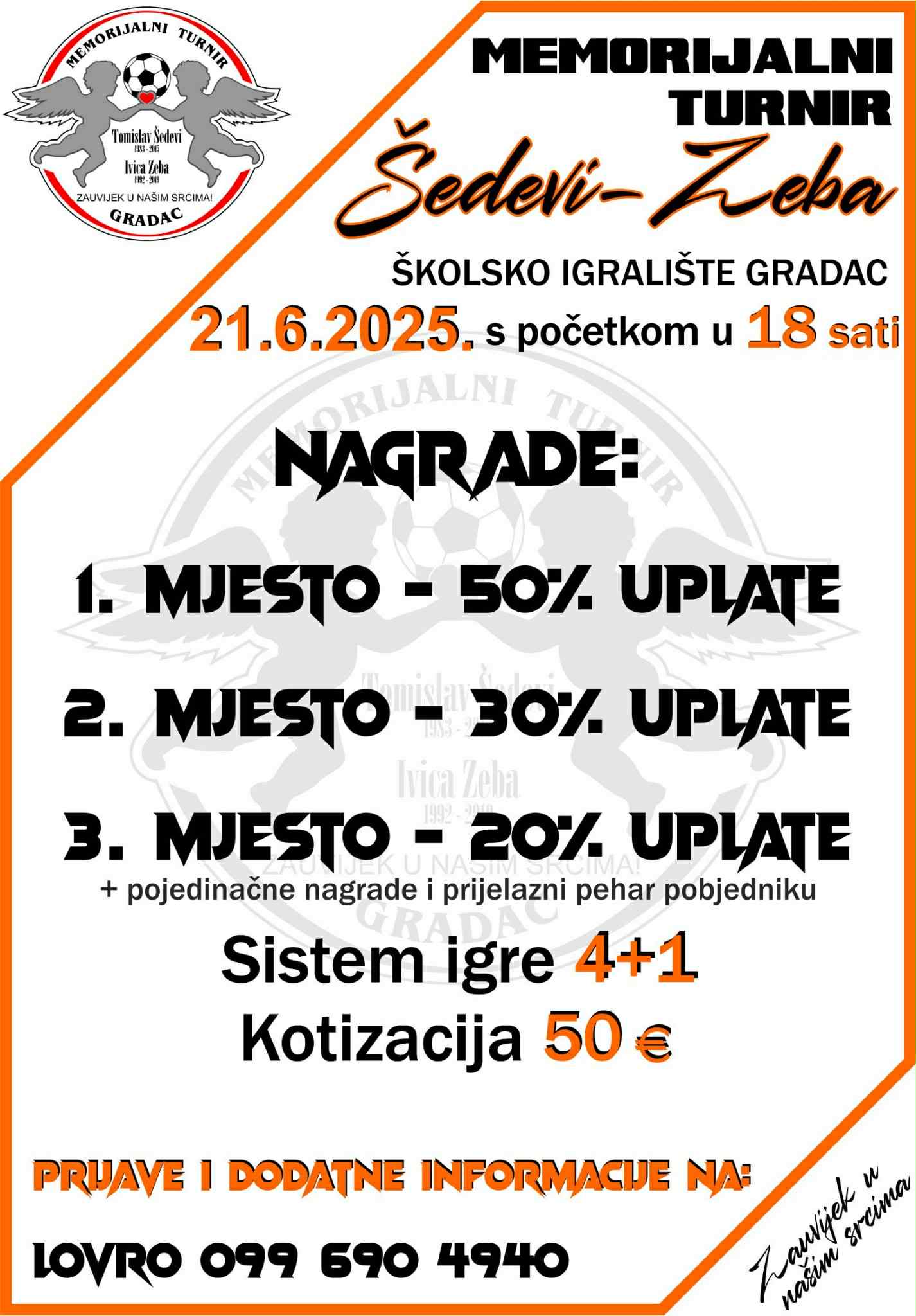 GRADAC – Novo izdanje Memorijalnog turnira “Tomislav Šedevi – Ivica Zeba” je pred vratima i održat će se u subotu, 21. lipnja 2025. u Gradcu (Pleternica).