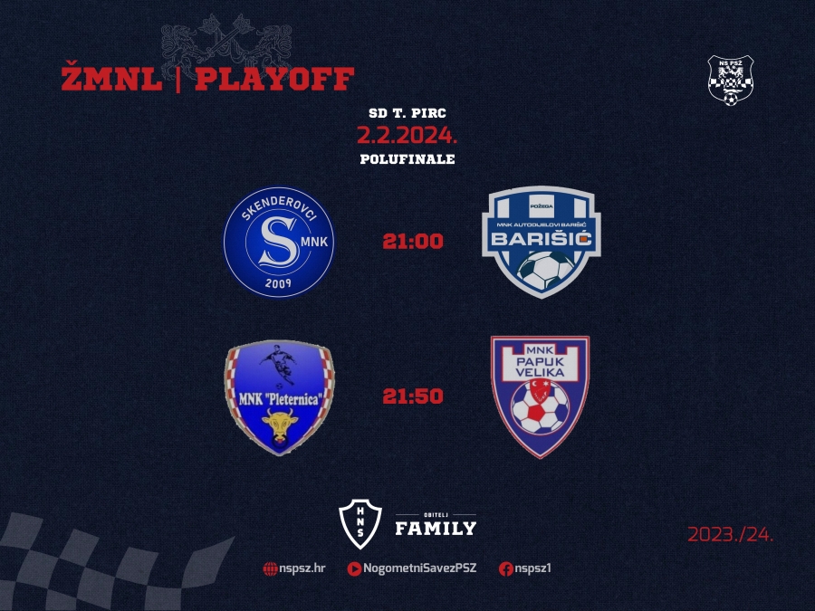 U Sportskoj dvorani Tomislav Pirc, u petak, 02. veljače igraju se polufinalne utakmice Županijske malonogometne lige, a u subotu, 03. veljače susret za 3. mjesto i finale