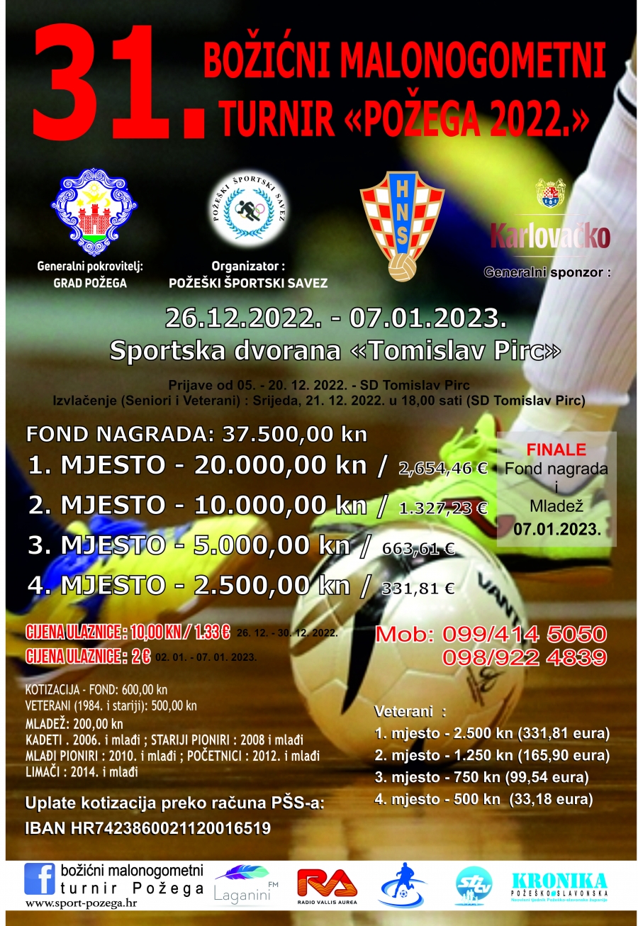 31. Božićni malonogometni turnir "Požega 2022" u ponedjeljak, 19. prosinca na Slavonsko - brodskoj televiziji