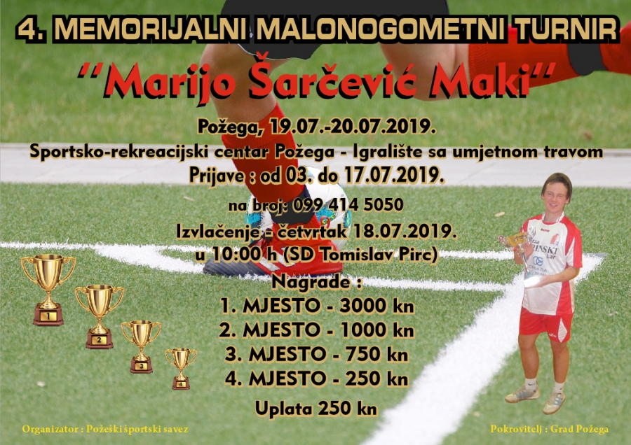 Raspored utakmica 4. Memorijalnog malonogometnog turnira "Marijo Šarčević - Maki" (SRC Požega, 19. i 20. 07. 2019.)