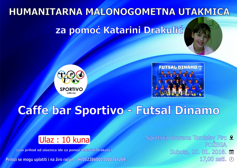 Humanitarna malonogometna utakmica Caffe bar Sportivo - Futsal Dinamo odigrat će se u subotu, 20. 01. 2018. s početkom u 17,00 sati