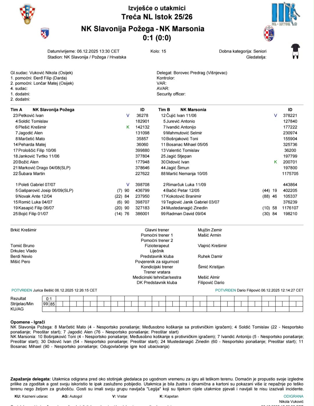 POŽEGA – Nogometaši Slavonije poraženi su danas na igralištu NK Požega od Marsonie (Slavonski Brod) rezultatom 0:1 (0:0) u susretu 15. kola 3. Nogometne lige – Istok. Bilo je to i posljednje kolo prvog dijela sezone, a Marsonia je ovom pobjedom došla i do jesenskog naslova prvaka.