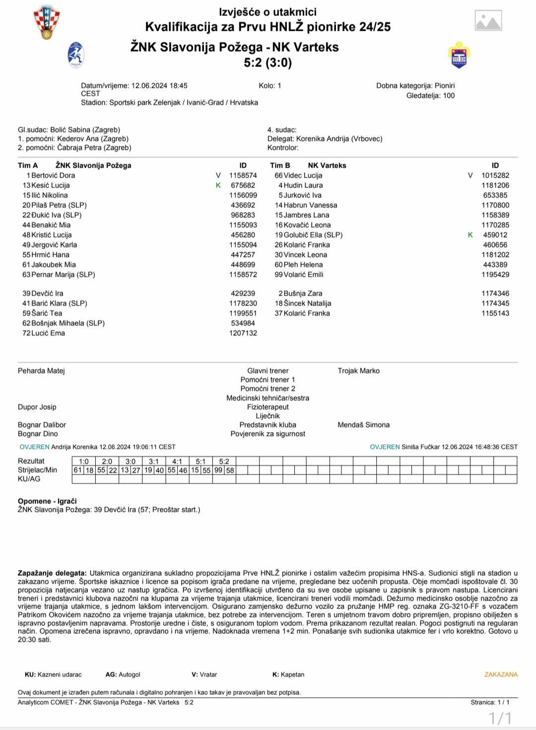 Pionirke požeškog kluba bile su još uvjerljivije i ostvarile pobjedu rezultatom 5:2 (3:0). Ovaj susret praktički je bio riješena nakon prvog poluvremena jer je ekipa Slavonije Požega na odmor otišla s vodstvom od 3:0. Mia Jakoubek zabila je za vodstvo u 18. minuti, a Hana Hrmić i Lucija Kesić su povećale rezultat na 3:0 golovima u 22. i 27. minuti. Ella Golubić je u 40. minuti smanjila na 3:1. U 55. minuti Hana Hrmić je postigla svoj drugi pogodak za povećanje vodstva na 4:1, a Nikolina Ilić je deset minuta poslije zabila za visokih 5:1. Konačnih 5:2 postavila je Emili Volarić u 58. minuti.
