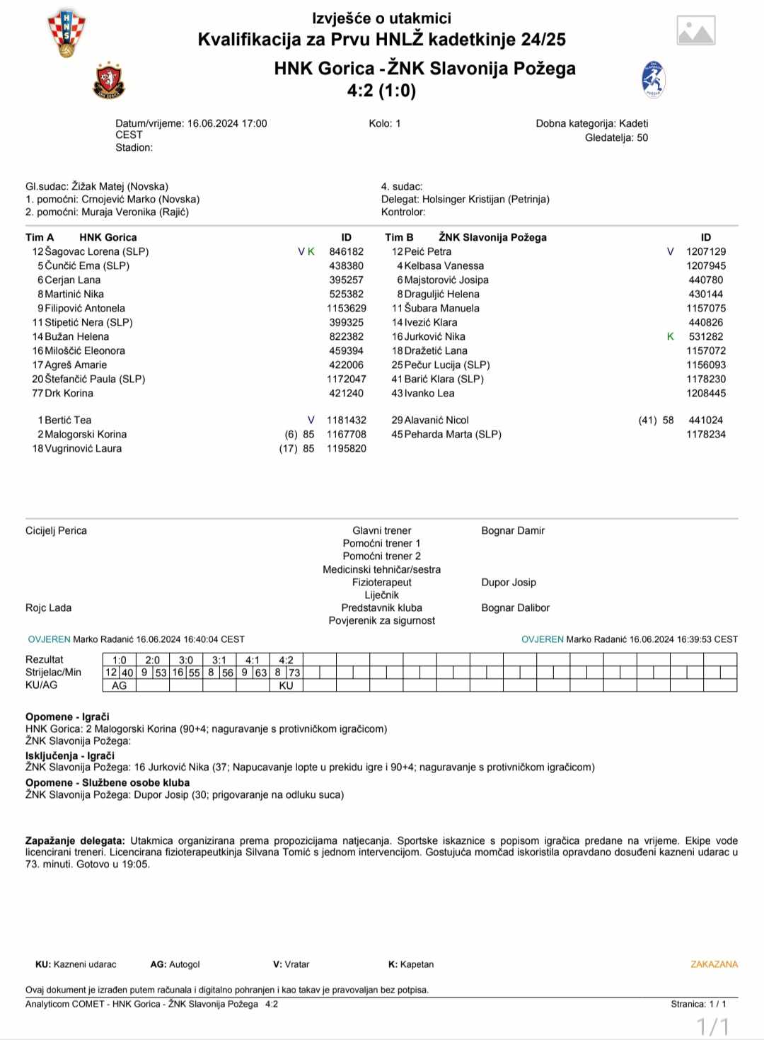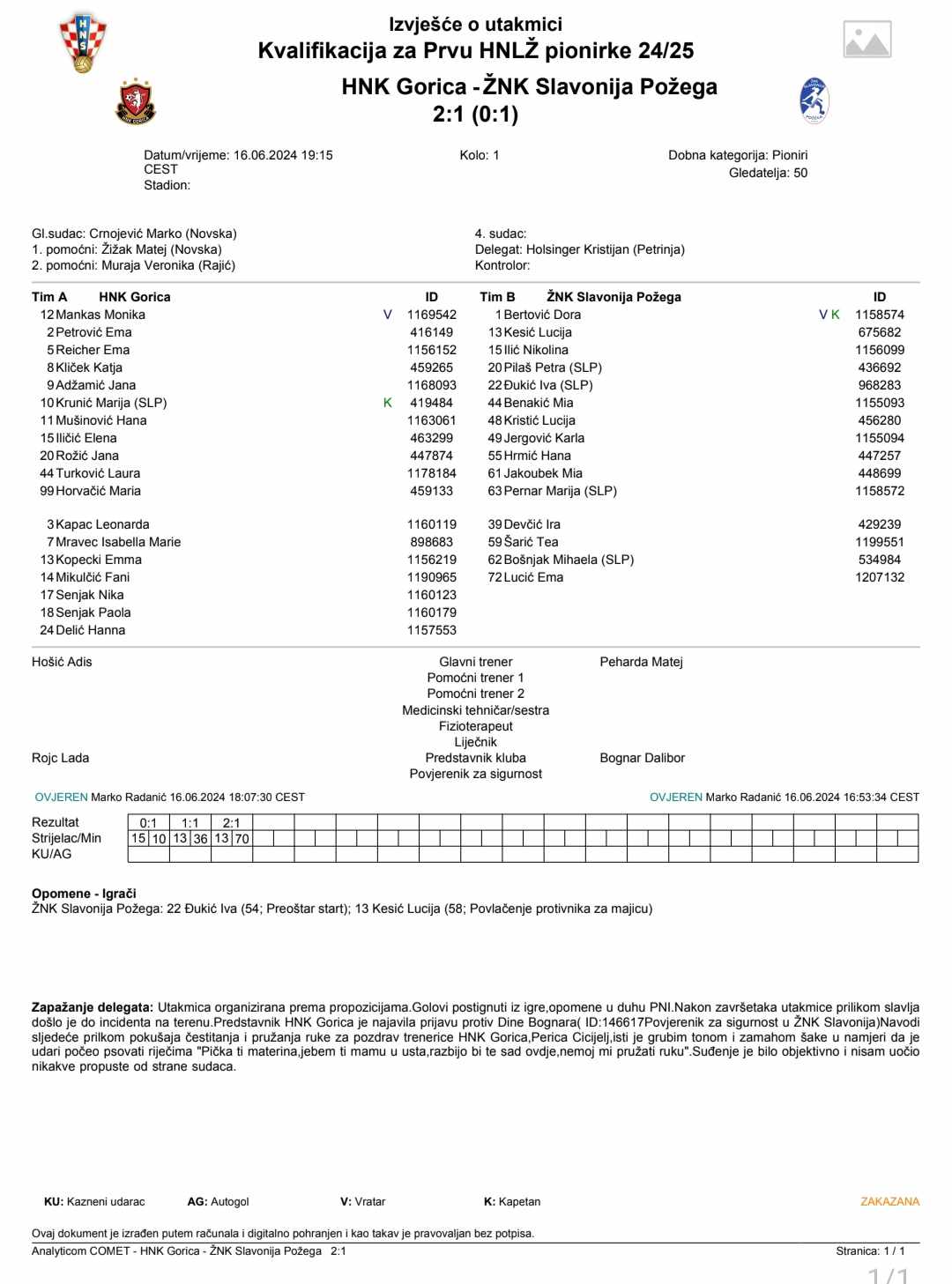 Nakon toga su igrale pionirke oba kluba. Nikolina Ilić je u 10. minuti dovela Slavoniju Požega u vodstvo od 0:1, a izjednačila je Emma Kopecki u 36. minuti. Ista igračica je u posljednjoj, 70. minuti dovela Goricu do pobjede postigavši pogodak za konačnih 2:1.