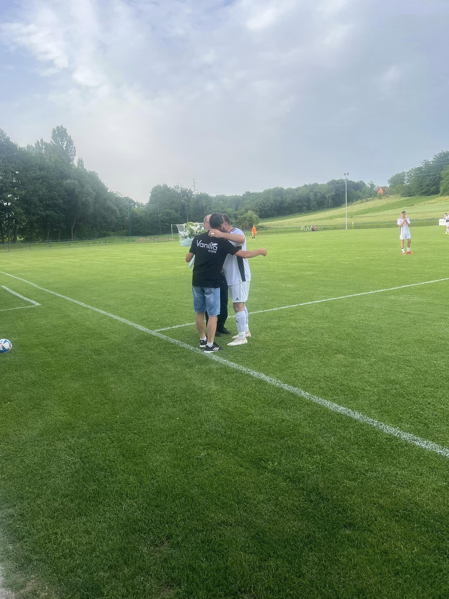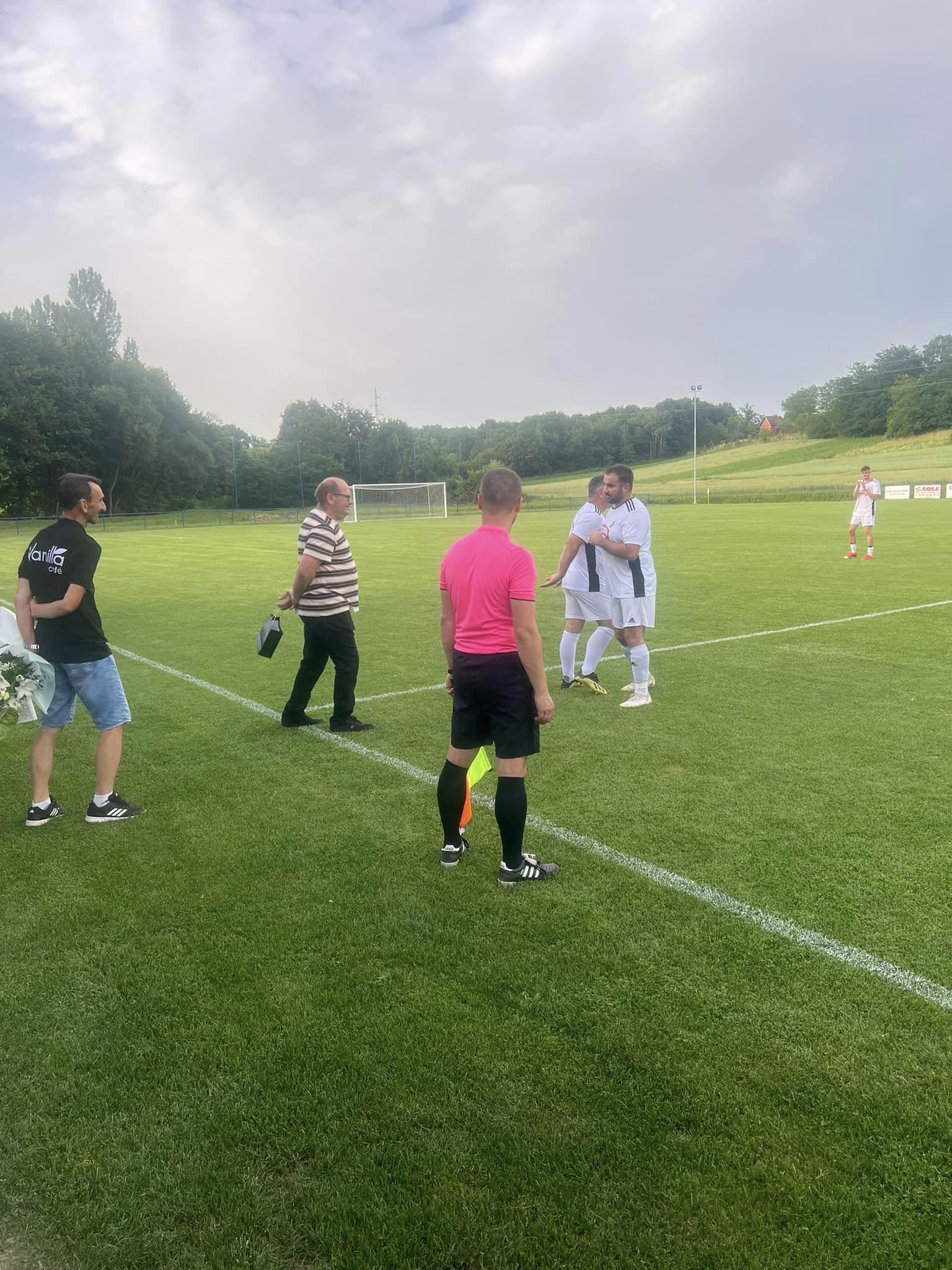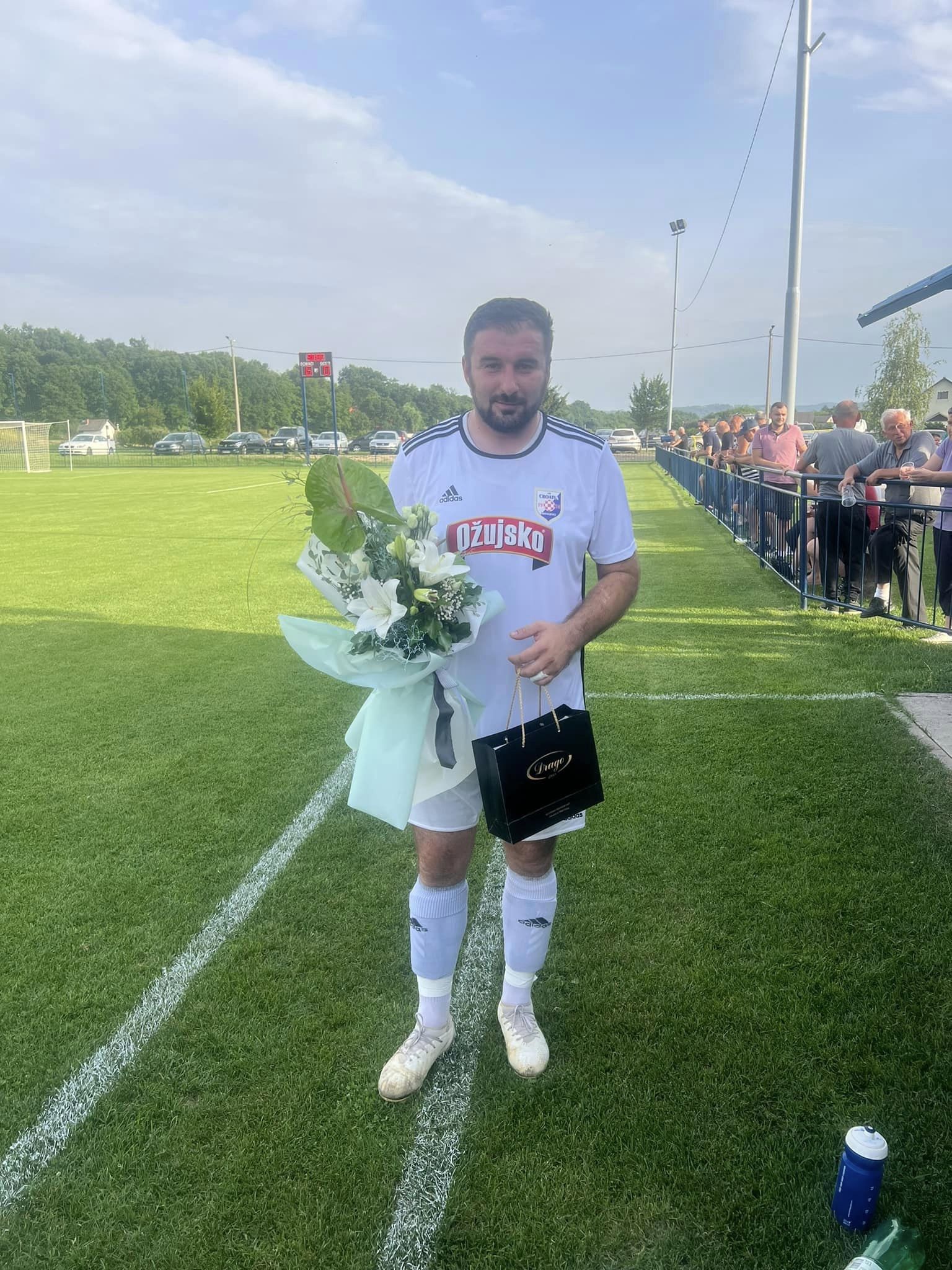 Predsjednik Dražen Franjić po izlasku s terena mu je za uspomenu na posljednji nastup uručio prigodni poklon, a tajnik Vlado Deanović pripremio je i buket cvijeća za kapetana Croatie.