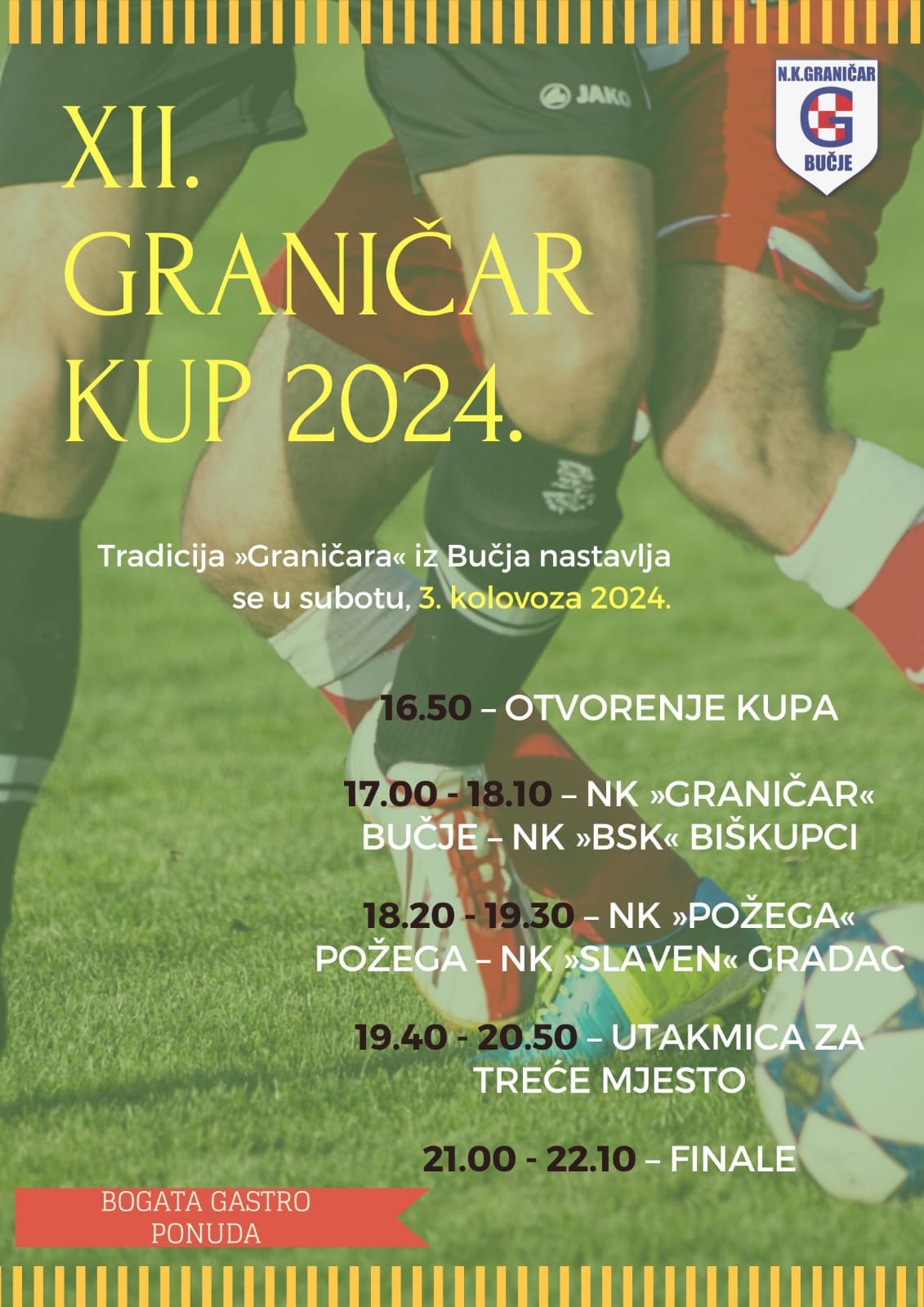 U subotu, 03. kolovoza Požega će nastupiti na 12. Graničar kupu 2024. u Bučju koji organizira tamošnji Graničar. Požega će igrati protiv Slavena (Gradac) u 18,20 sati, a nakon toga utakmicu za 3. mjesto ili finale protiv domaćina ili BSK-a (Biškupci).