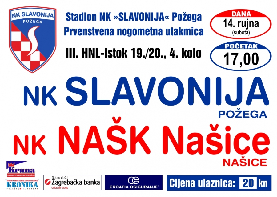 Slavonija u subotu, 14. rujna s početkom u 17,00 sati dočekuje NK NAŠK (Našice) u 4. kolu 3. HNL - Istok