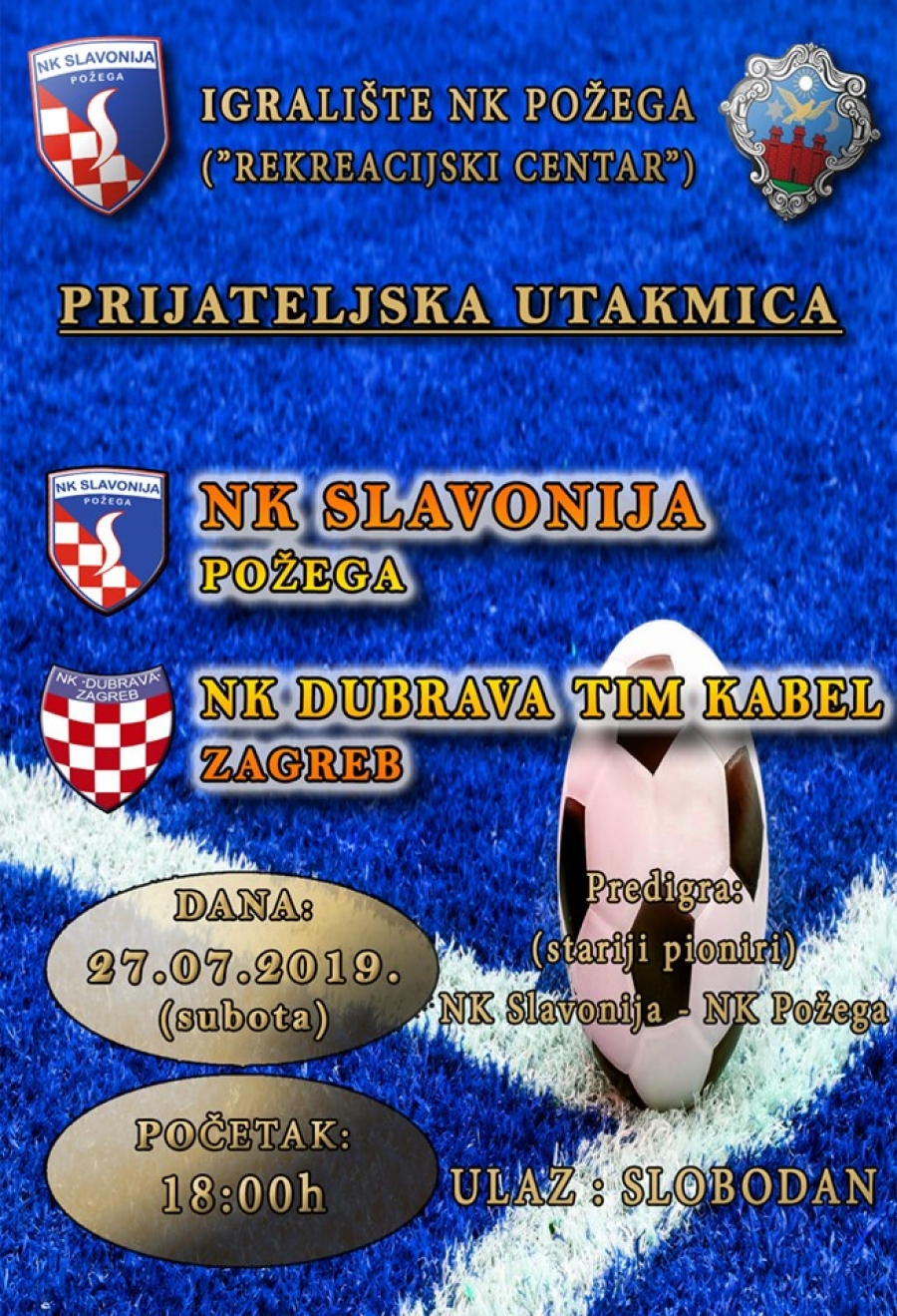 Slavonija prvu pripremnu utakmicu igra u subotu, 27. 07. u 18,00 sati protiv drugoligaša Dubrave Tim Kabel (Zagreb) na Igralištu NK Požega