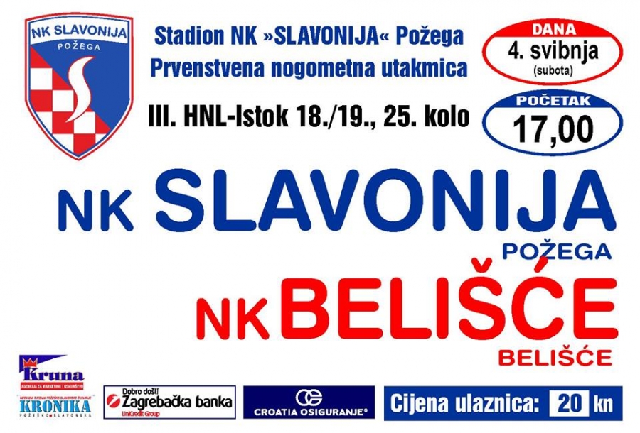 Slavonija u subotu, 04. svibnja s početkom u 17,00 sati dočekuje NK Belišće u 25. kolu 3. HNL - Istok