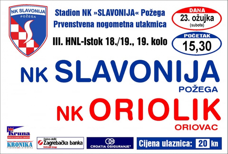 Slavonija u subotu, 23. 03. 2019. s početkom u 15,30 sati dočekuje NK Oriolik (Oriovac) u 19. kolu 3. HNL - Istok