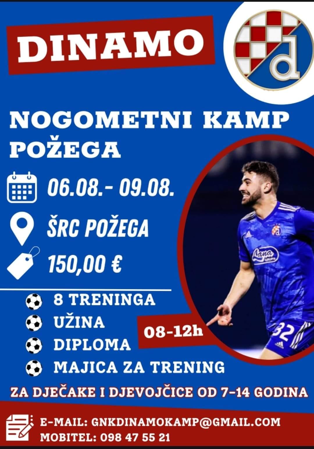 U Požegi će se od 06. do 09. kolovoza 2024. održati nogometni kamp GNK "Dinamo" Zagreb za dječake i djevojčice od 7 do 14 godina starosti