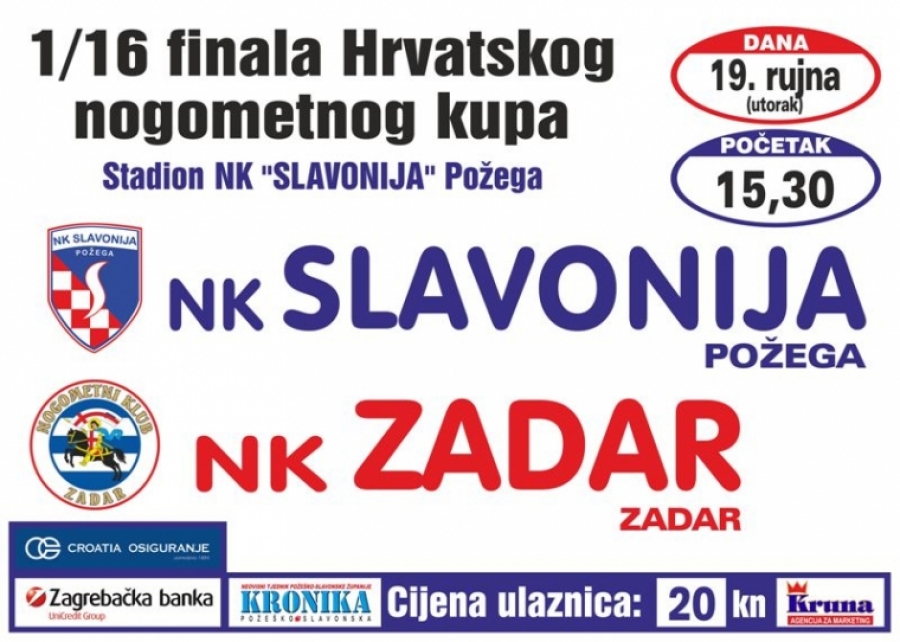 U utorak, 19. rujna u 15,30 sati na Stadionu kraj Orljave 1/16 finala Hrvatskog nogometnog kupa : NK Slavonija (Požega) - NK Zadar