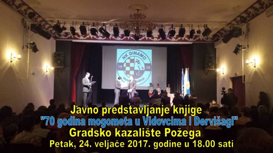 U Gradskom kazalištu Požega u petak, 24. veljače s početkom u 18,00 sati bit će predstavljena knjiga "70 godina nogometa u Vidovcima i Dervišagi"