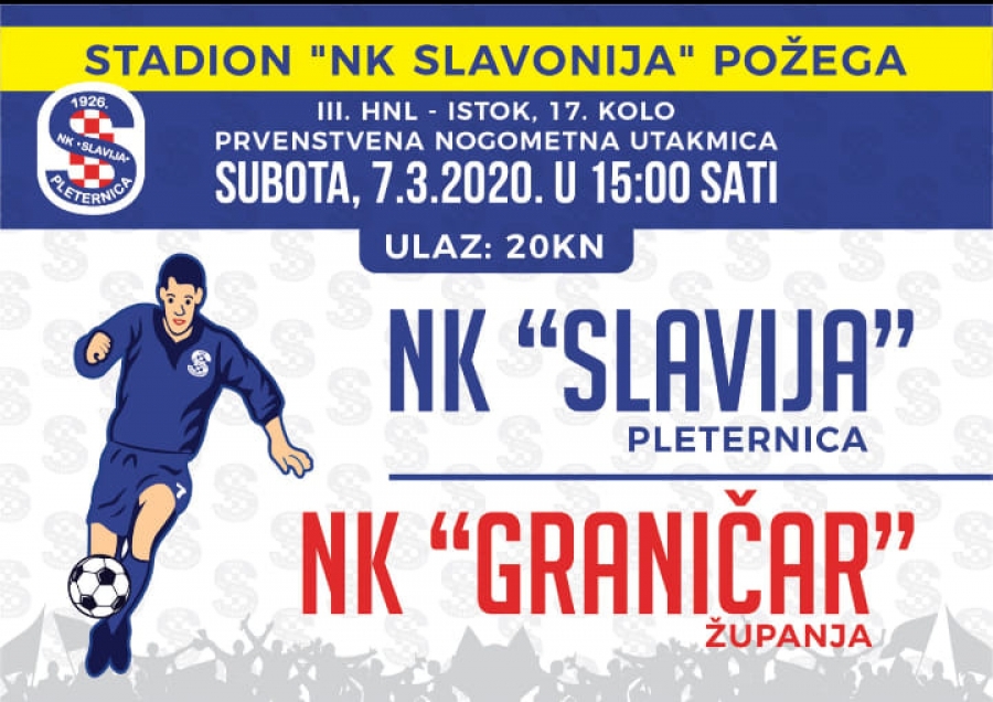 Nogometaši pleterničke Slavije će susret 17. kola 3. HNL - Istok protiv Graničara (Županja) odigrati u subotu, 07. ožujka u Požegi na Stadionu Slavonije