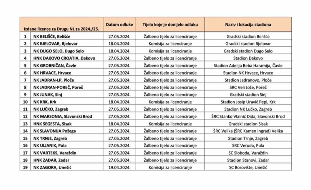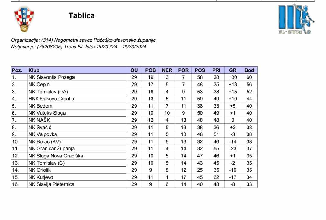 ZAGREB / POŽEGA – Nogometni klub Slavonija je kolo prije kraja sezone u 3. Nogometnoj ligi – Istok domaćom pobjedom nad NAŠK-om (Našice) osigurao novi naslov prvaka, a ovog tjedna dobio je i potrebnu licencu za nastup u 2. Nogometnoj ligi u sezoni 2024./2025. te će momčad trenera Kreše Poletija i Krešimira Čuljka moći nastupiti u predstojećim kvalifikacijama za taj rang.