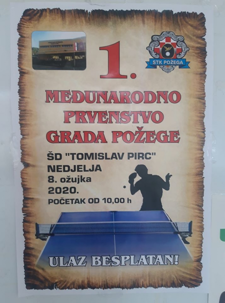 U nedjelju, 08. 03. 2020. od 10,00 do 18,30 sati u SD Tomislav Pirc održat će se 1. Međunarodno prvenstvo grada Požege u stolnom tenisu