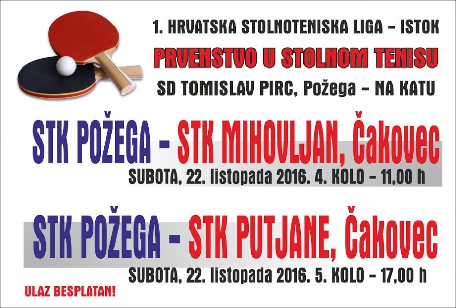 Stolnotenisači Požege u subotu, 22. listopada igraju prve domaće utakmice u 1. Hrvatskoj stolnoteniskoj ligi - Istok