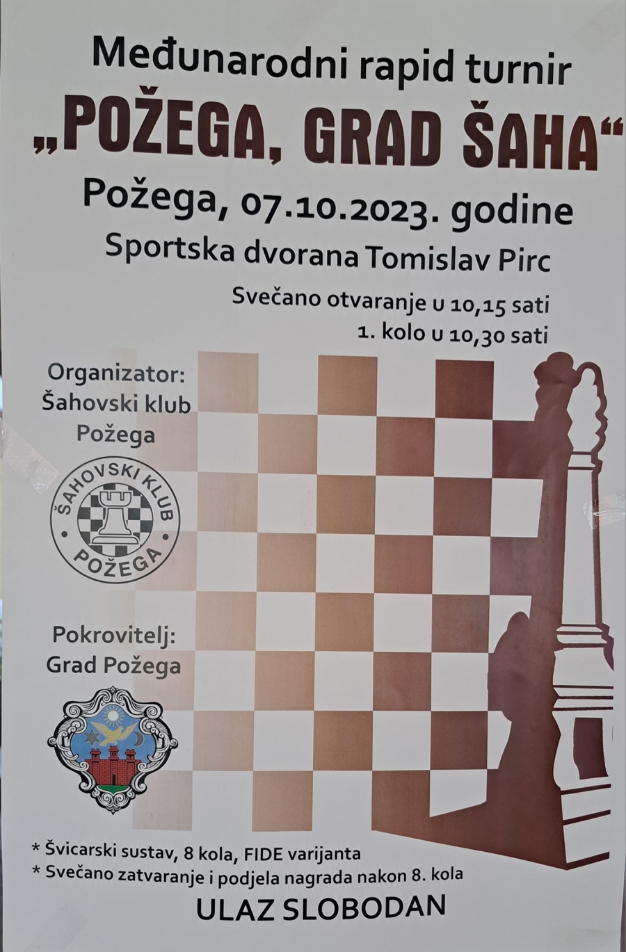 U subotu, 07. listopada u SD Tomislav Pirc održat će se Međunarodni rapid turnir "Požega, grad šaha"