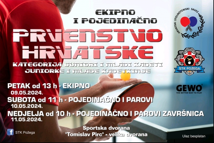 Ekipno i pojedinačno Prvenstvo Hrvatske u stolnom tenisu za mlađe kadete i juniore održat će se od petka do nedjelje u Sportskoj dvorani Tomislav Pirc