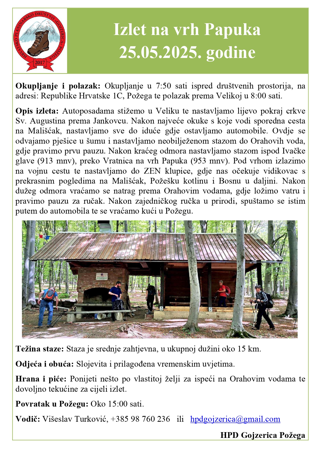 VELIKA – Planinari HPD Gojzerica Požega ove nedjelje uputili su se na vrh Papuka (953 mnv) pod stručnim vođenjem predsjednika Višeslava Turkovića, dok je zaleđe čuvao potpredsjednik društva Boro Jukić.