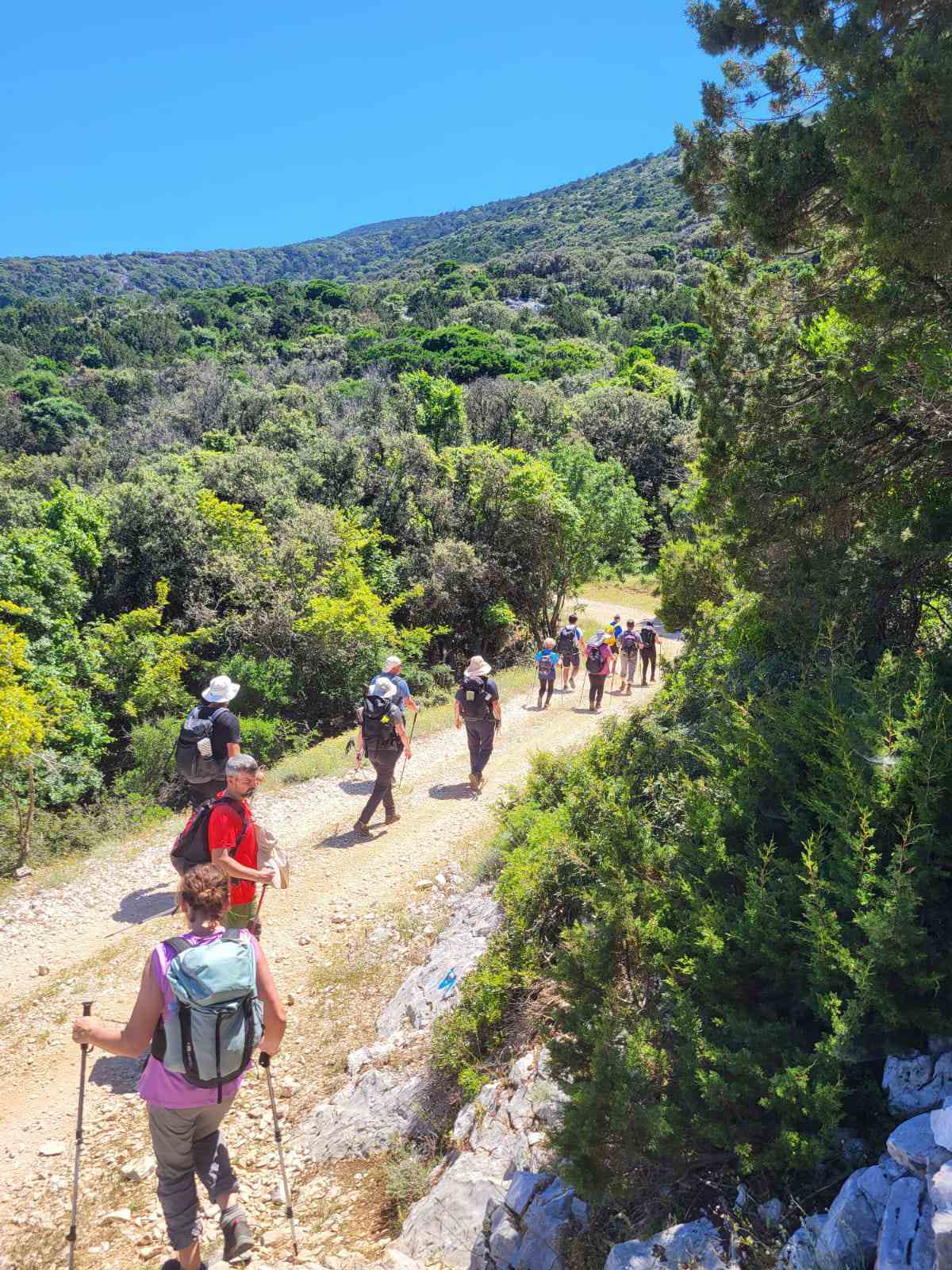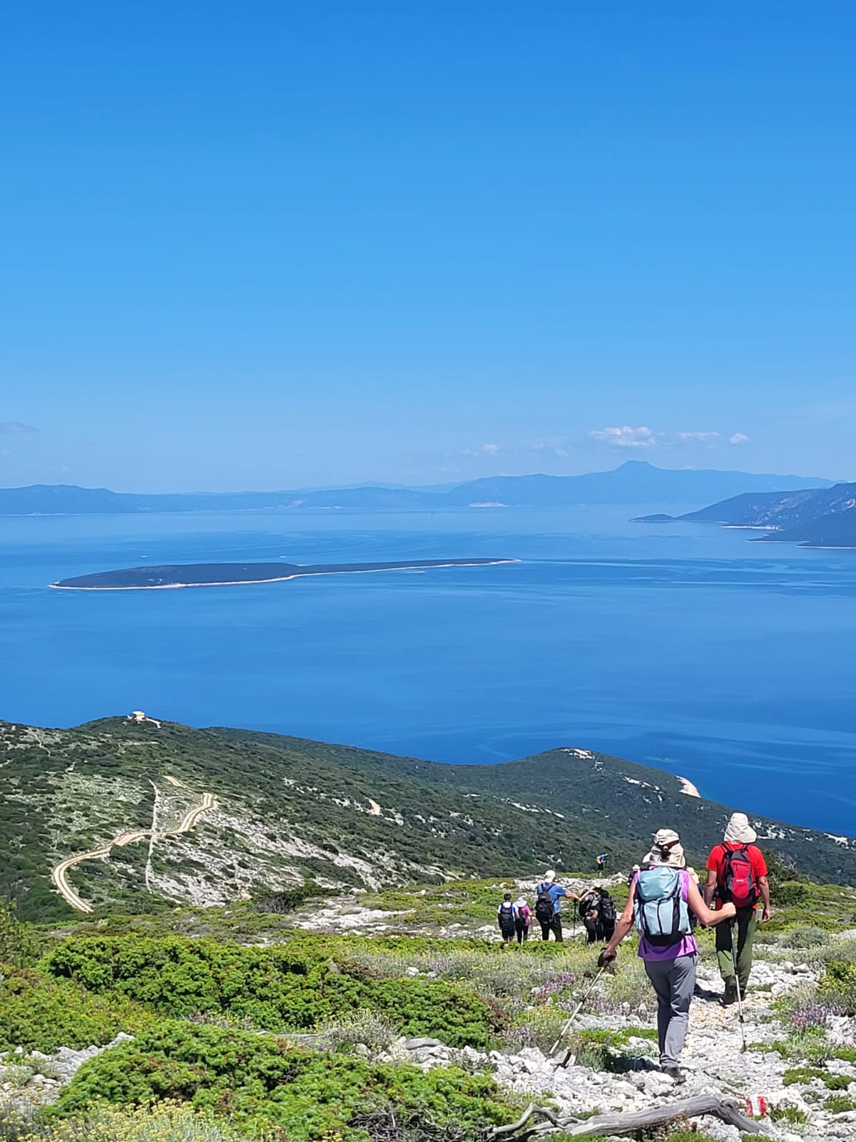 Hvala Dragi što nam je pripremio meso i Miki i Mariu što su to sve skupa ispekli na roštilju, a bilo je tu dosta posla. Trebalo je nahraniti 19 osoba. Nakon večere ostajemo zabavljati se na terasi. Bilo je tu svega, priče, smijeha, pjesme, jer gdje je Vjeko tu je i harmonika. Ujutro nakon doručka odlazimo na našu današnju turu: Nerezine – Počivalice – vrha Sv. Mikula – Televrin – dom Sv. Gaudent – Osor. Za prehodati tu stazu potrebno je 5 sati čistog hoda. Naravno da je nama trebalo puno više jer smo gotovo cijelim putem uživali u prekrasnim pogledima. Staza isprva prolazi pored suhozida, zatim kroz šumu i uskoro stižemo na Poćivalice, no tu se ne zadržavamo dugo nego idemo još nekih 40 min do vrha Sv. Mikula (557mnv). Na vrhu se nalazi kapelica Sv. Nikole izgrađena u 14. stoljeću. S vrha se pruža predivan pogled na čitavo otočje Cresko-Lošinjskog arhipelaga.