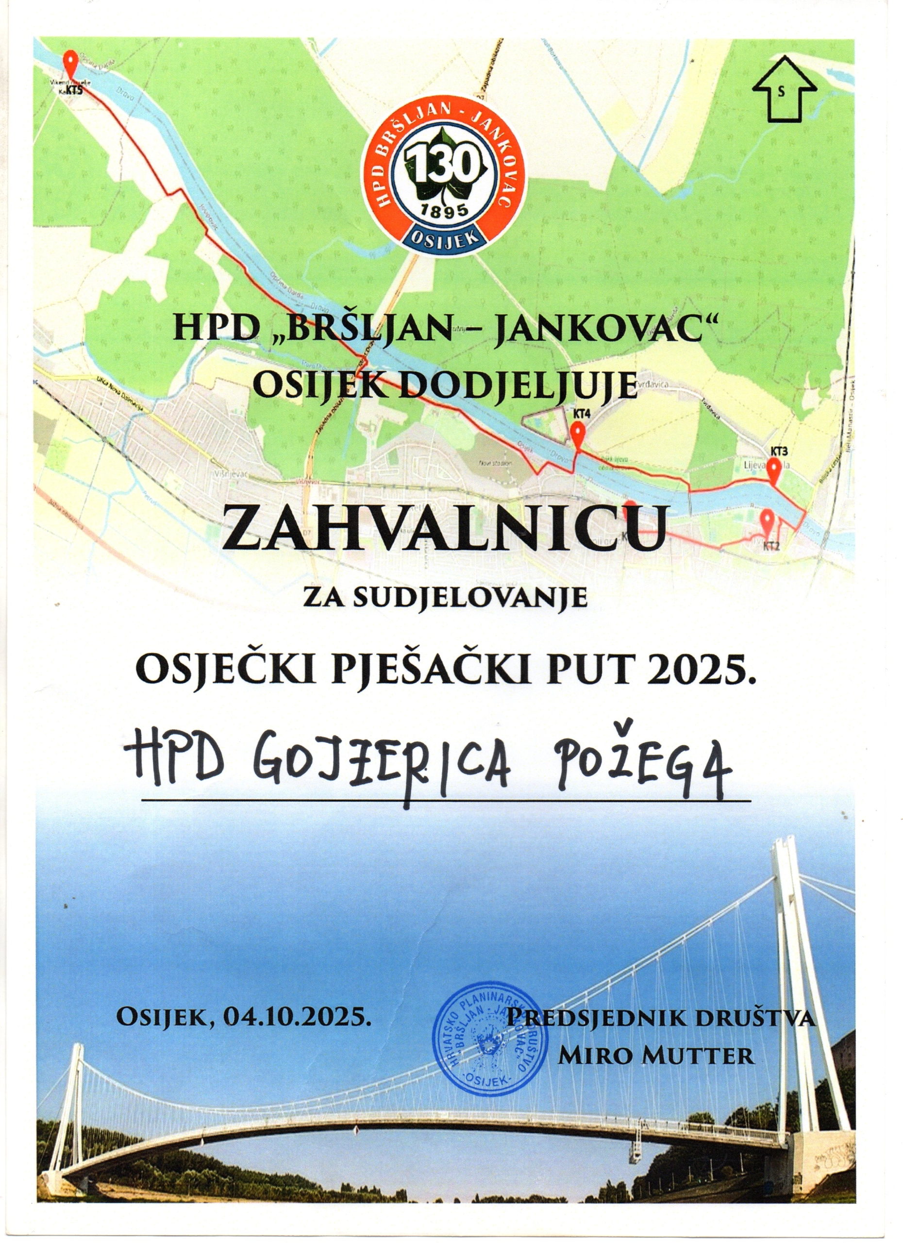 OSIJEK – Planinari HPD Gojzerica Požega u subotu 4. listopada 2025. godine posjetili su Osijek gdje su s prijateljima iz HPD Bršljan-Janovac prehodali tradicionalni Osječki pješački put.