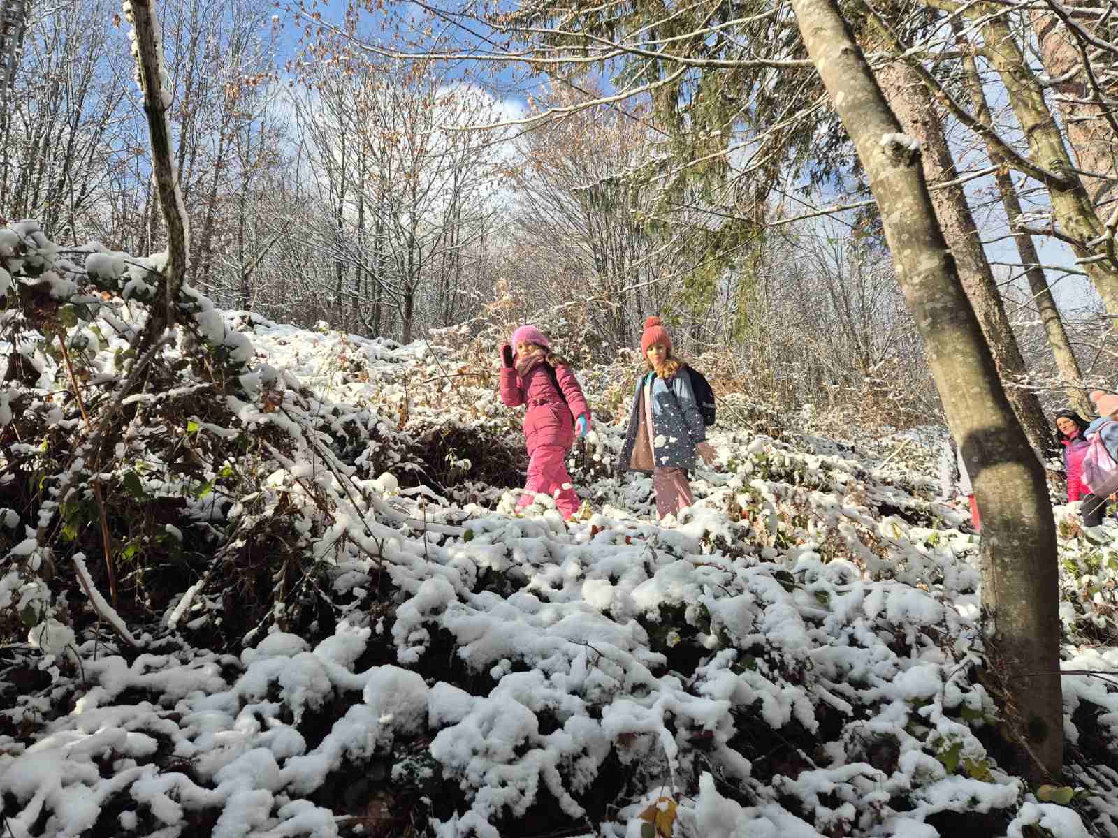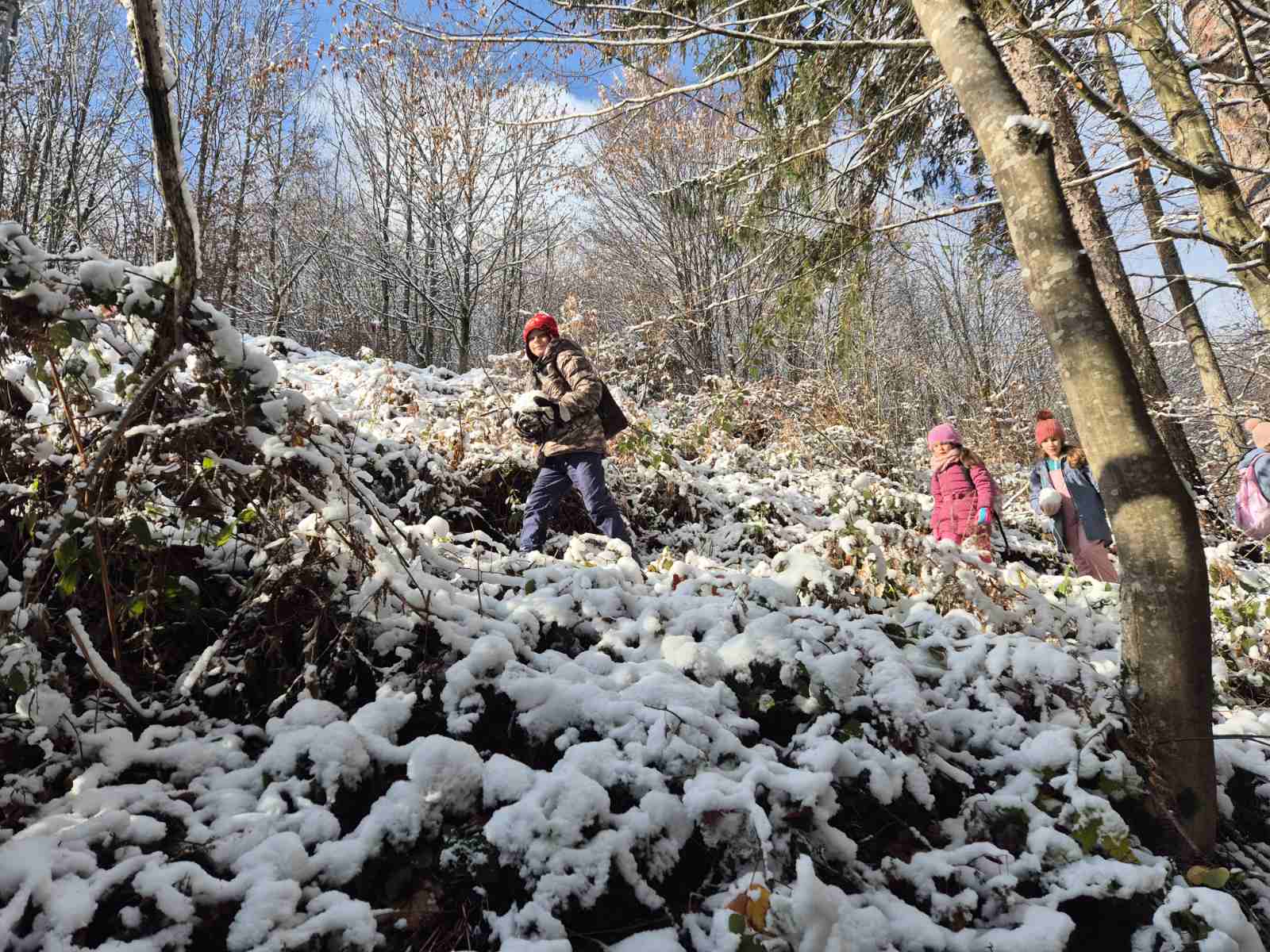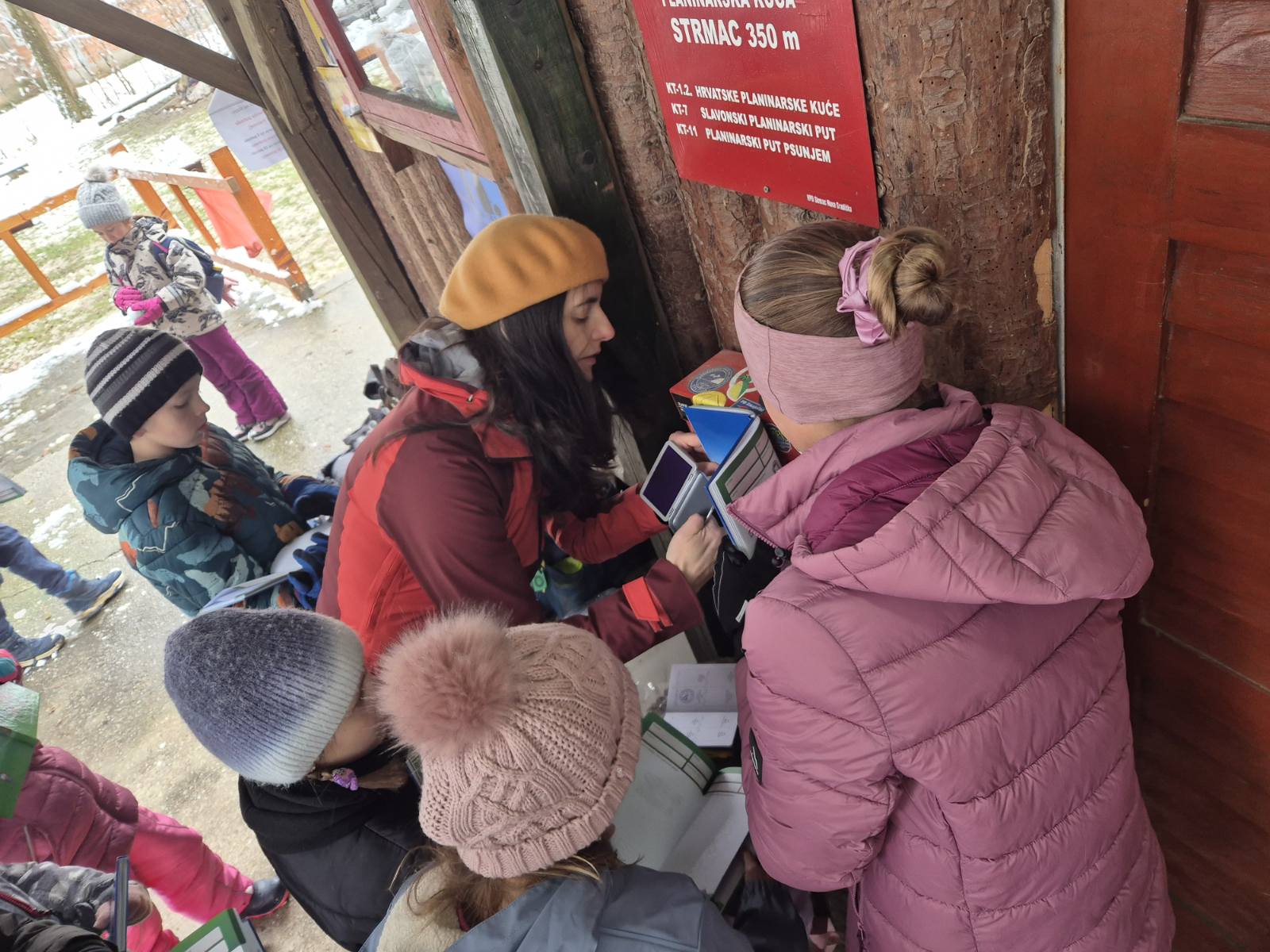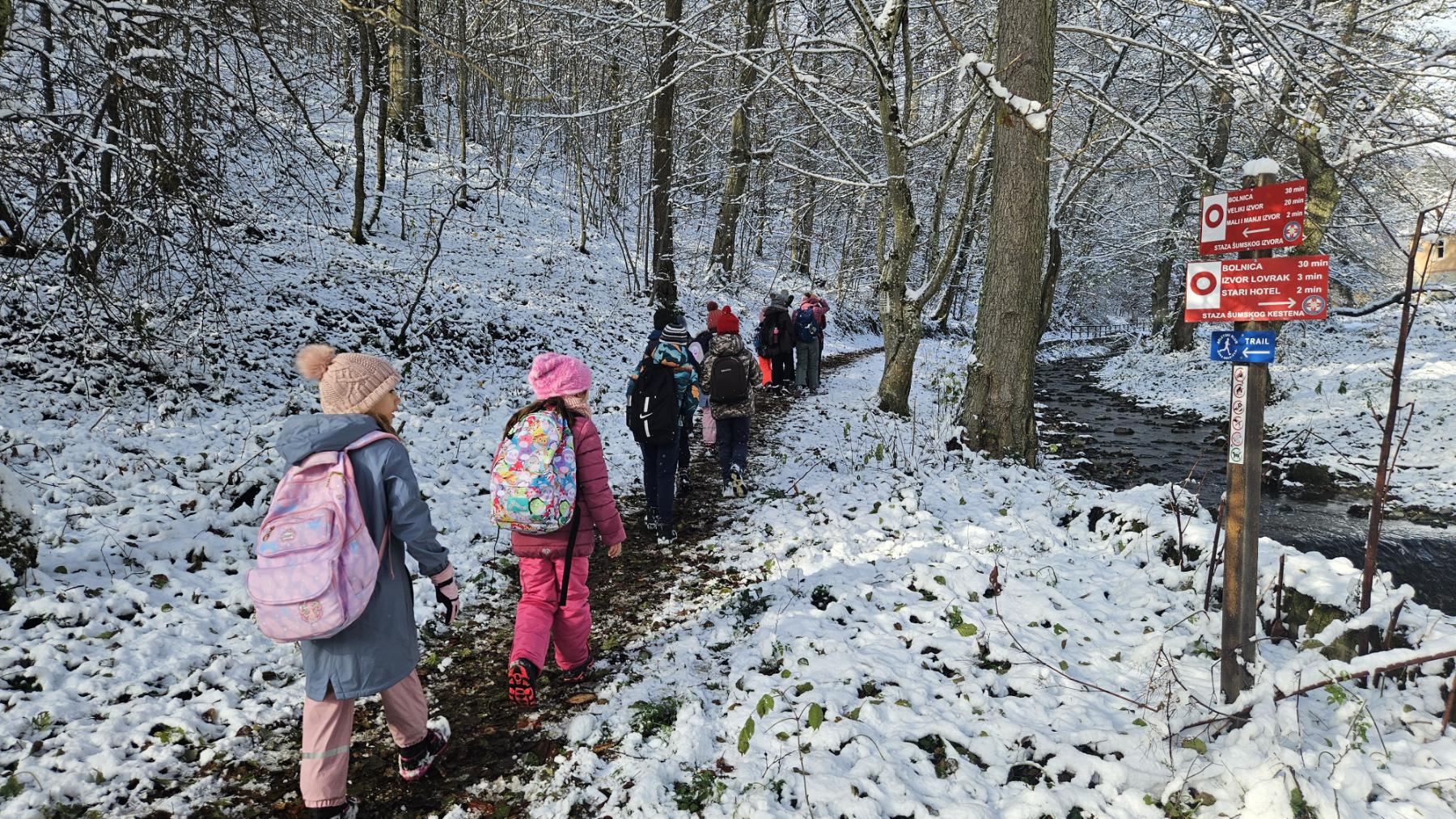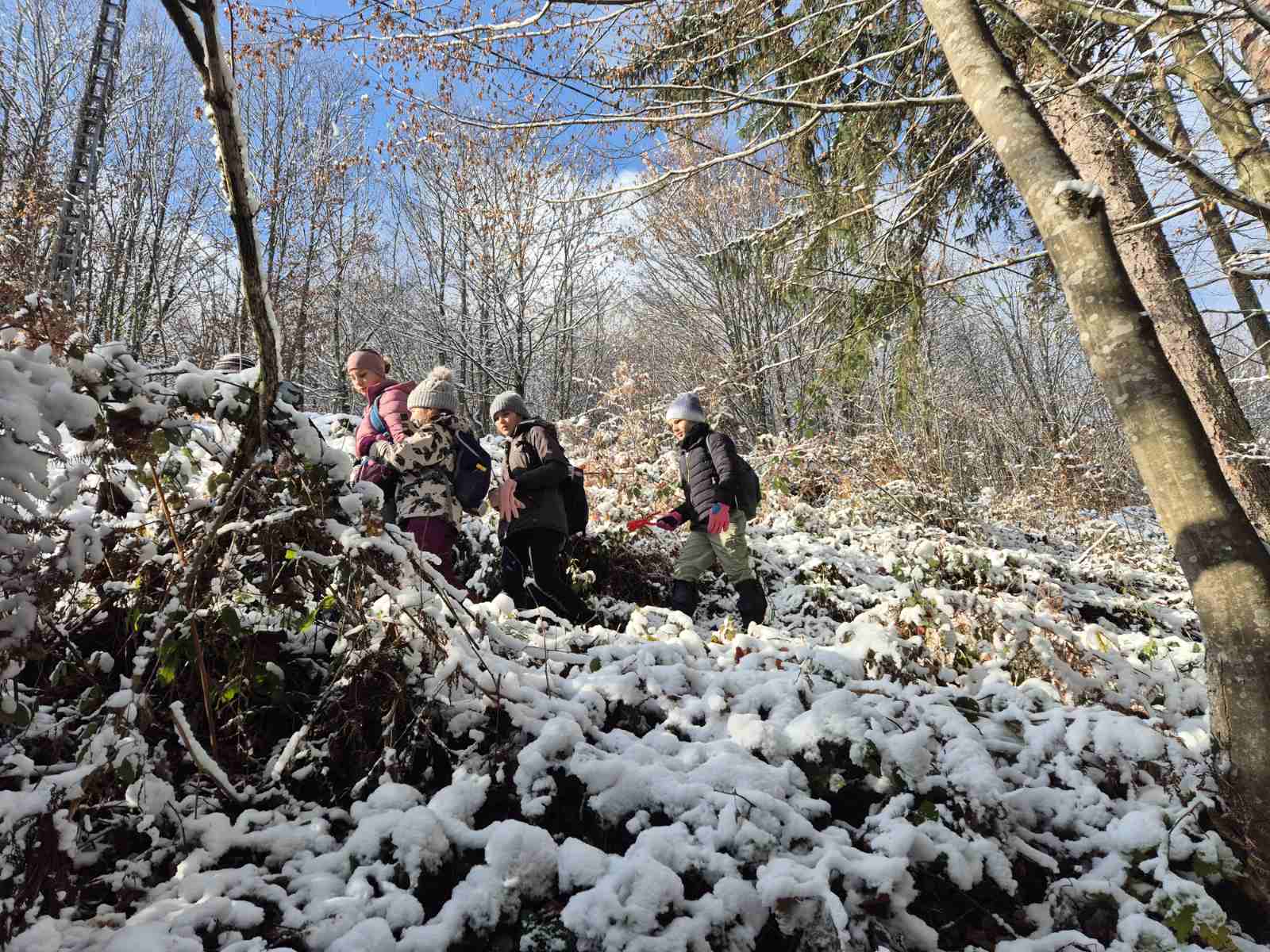 Potom se krenulo na stazu Malog izvora i divljeg kestena, koja je prekrivena snijegom postala posebno zanimljiva. Djeca su se cijelim putem grudala, skidala ledenice s grana, proučavala tragove u mekom snijegu i veselo napredovala kroz šumu. Otkrili smo im i čarobni svijet geocachinga, pa se cijela skupina pretvorila u male istraživače koji nestrpljivo tragaju za skrivenim „blagom“.