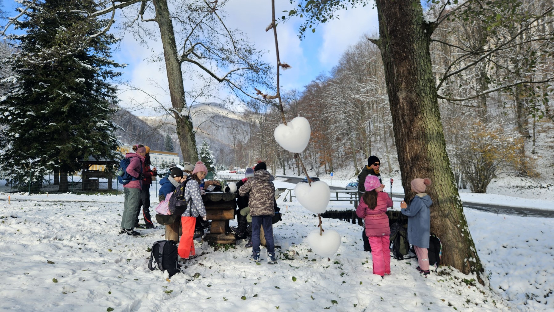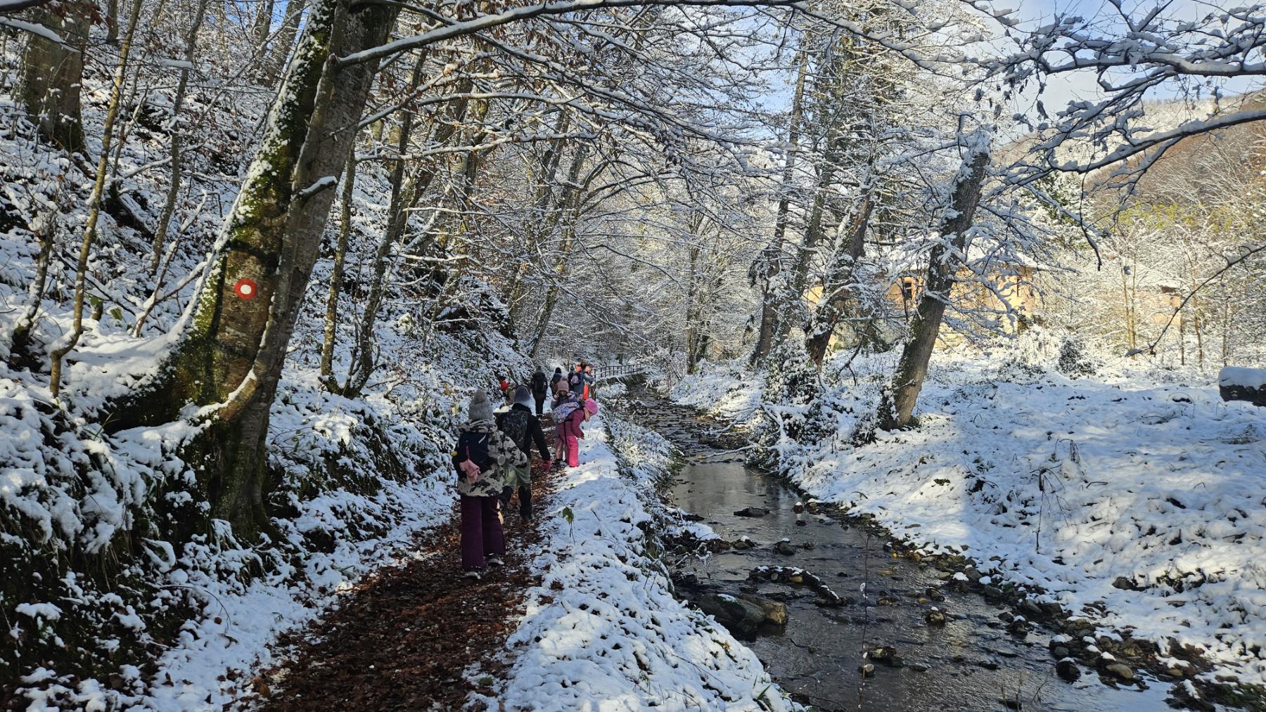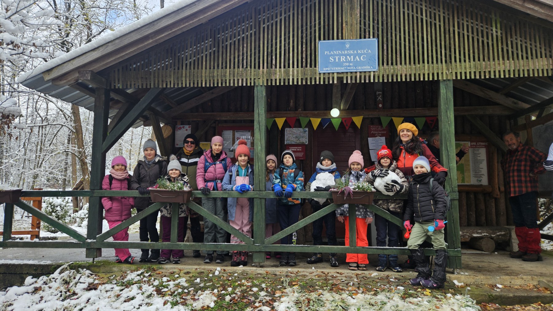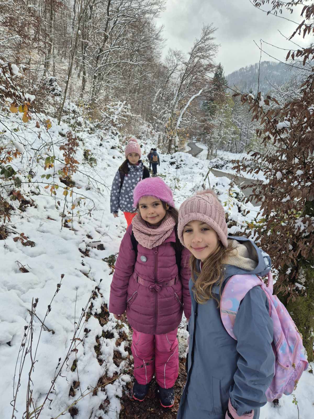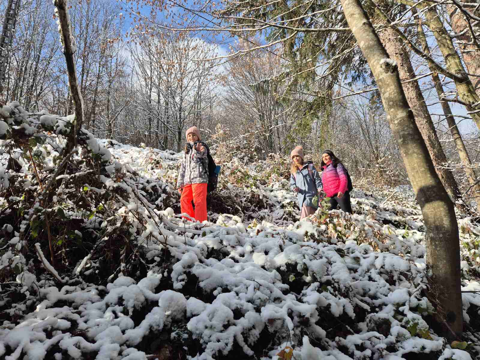 Potom se krenulo na stazu Malog izvora i divljeg kestena, koja je prekrivena snijegom postala posebno zanimljiva. Djeca su se cijelim putem grudala, skidala ledenice s grana, proučavala tragove u mekom snijegu i veselo napredovala kroz šumu. Otkrili smo im i čarobni svijet geocachinga, pa se cijela skupina pretvorila u male istraživače koji nestrpljivo tragaju za skrivenim „blagom“.