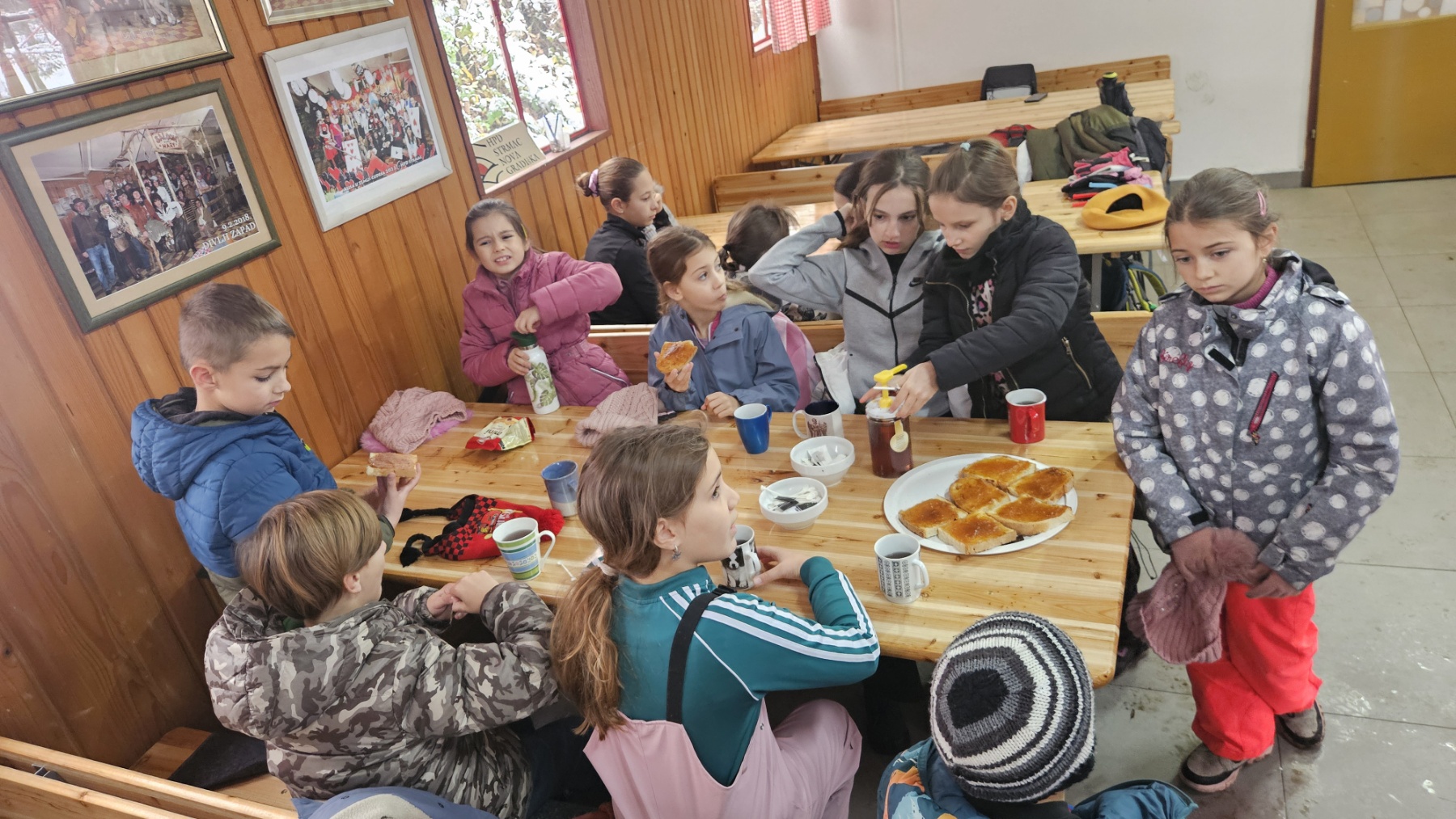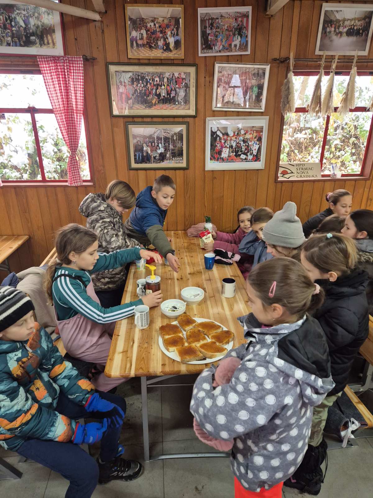 Na početku izleta Gojzići su upoznali toplu planinarsku dobrodošlicu u Planinarskoj kući Strmac gdje su ih planinari HPD Strmac lijepo ugostili i počastili kruhom s pekmezom i čajem.