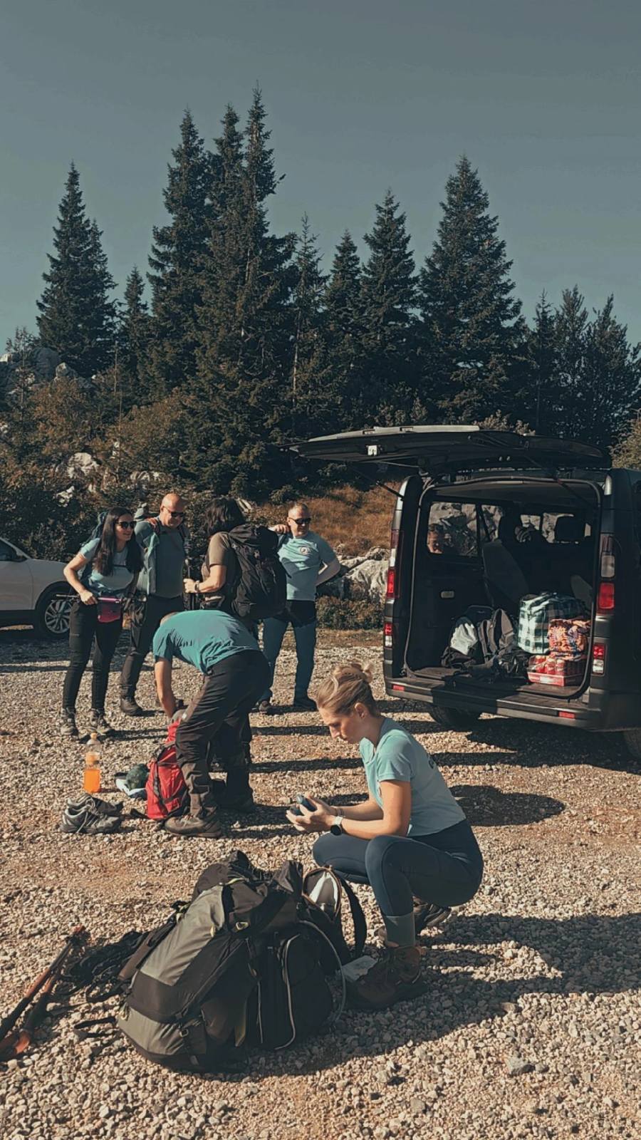 Davno je pao dogovor družine, slične onoj „prstenovoj“ koja je išla u Mordor spasiti Međuzemlje, da valja krenuti na put prije svitanja, ali ne spasiti Zemlju nego napuniti dušu neopisivim ljepotama, a sebe izložiti sunčevim zrakama i čistom zraku. Karta ‘Lijepe naše’ pokazala je na Nacionalni park Sjeverni Velebit, to je bila sudbina koju treba živjeti. Valjalo je družini tog subotnjeg jutra poraniti i krenuti na put prema čarobnom kraju. Osamnaest hrabrih planinara sa dva kombija putuje do svog odredišta. Veselje, pjesma, pa naizmjence spavanje tijekom vožnje, odmori uz put gdje su nastale neke od zanimljivih fotografija daju naslutiti kakav će to biti vikend pred njima.