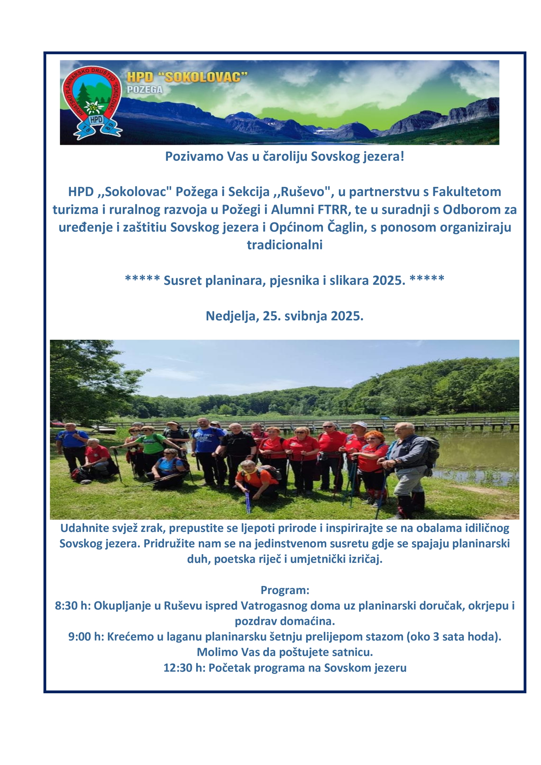 HPD ,,Sokolovac" Požega i Sekcija ,,Ruševo" u nedjelju, 25. 05. 2025. organiziraju tradicionalni "Susret planinara, pjesnika i slikara 2025."