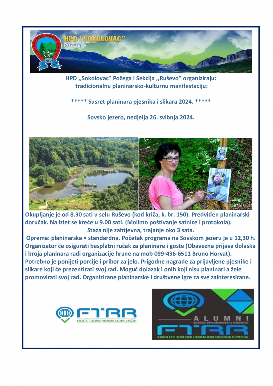 HPD ,,Sokolovac" Požega i Sekcija ,,Ruševo" organiziraju tradicionalni "Susret planinara pjesnika i slikara 2024." (Sovsko jezero, nedjelja 26. svibnja 2024.)