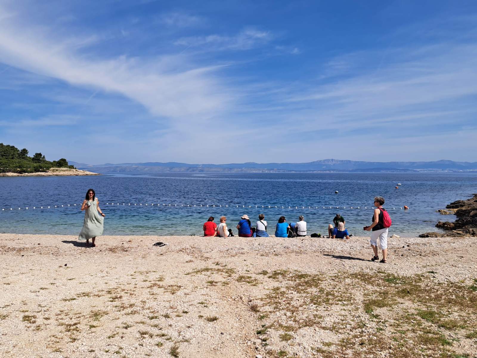 Nakon osvojenog vrha, spuštamo se do prve morske uvale u Stomorskoj – trenutak odmora, sunca i mira. Potom slijedi šetnja kroz Grohote, najstarije i najvažnije naselje na otoku. Mika nas vodi kroz njegovu bogatu povijest – od rimskih ostataka, crkve sv. Stjepana, groba Vesne Parun gdje smo i zapalili svijeću u ime cijelog društva, do dalmatinske arhitekture i priče o Slavića kuli.