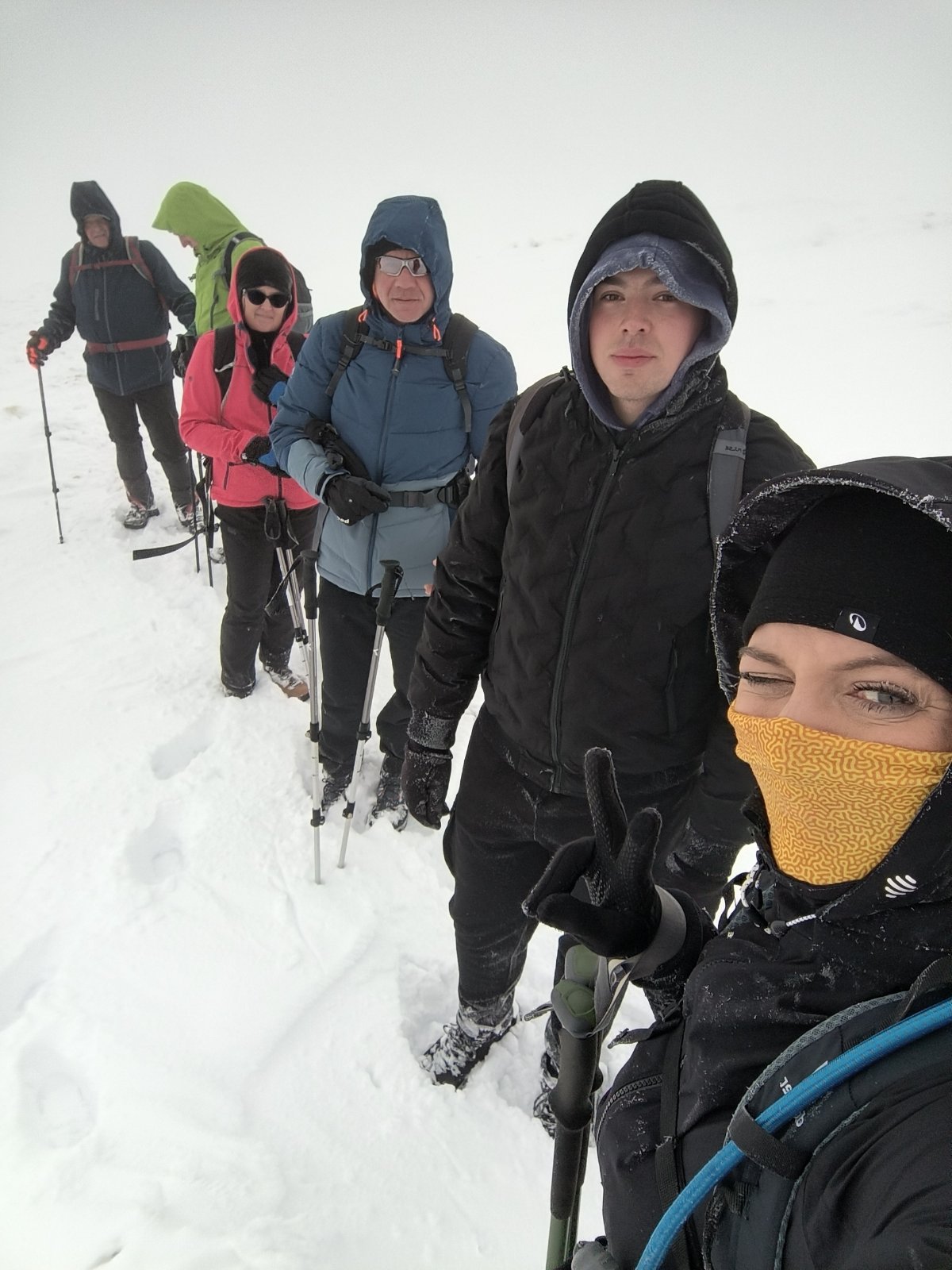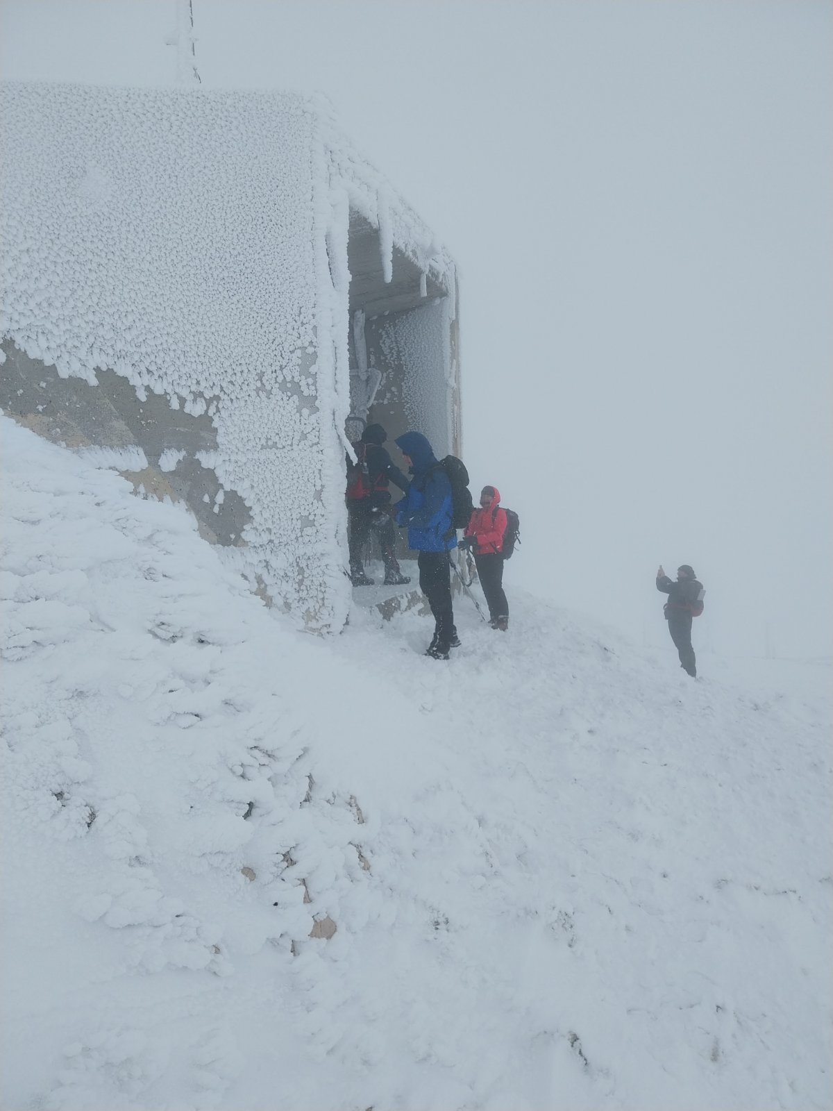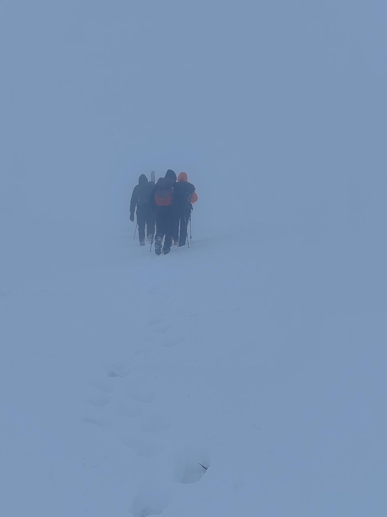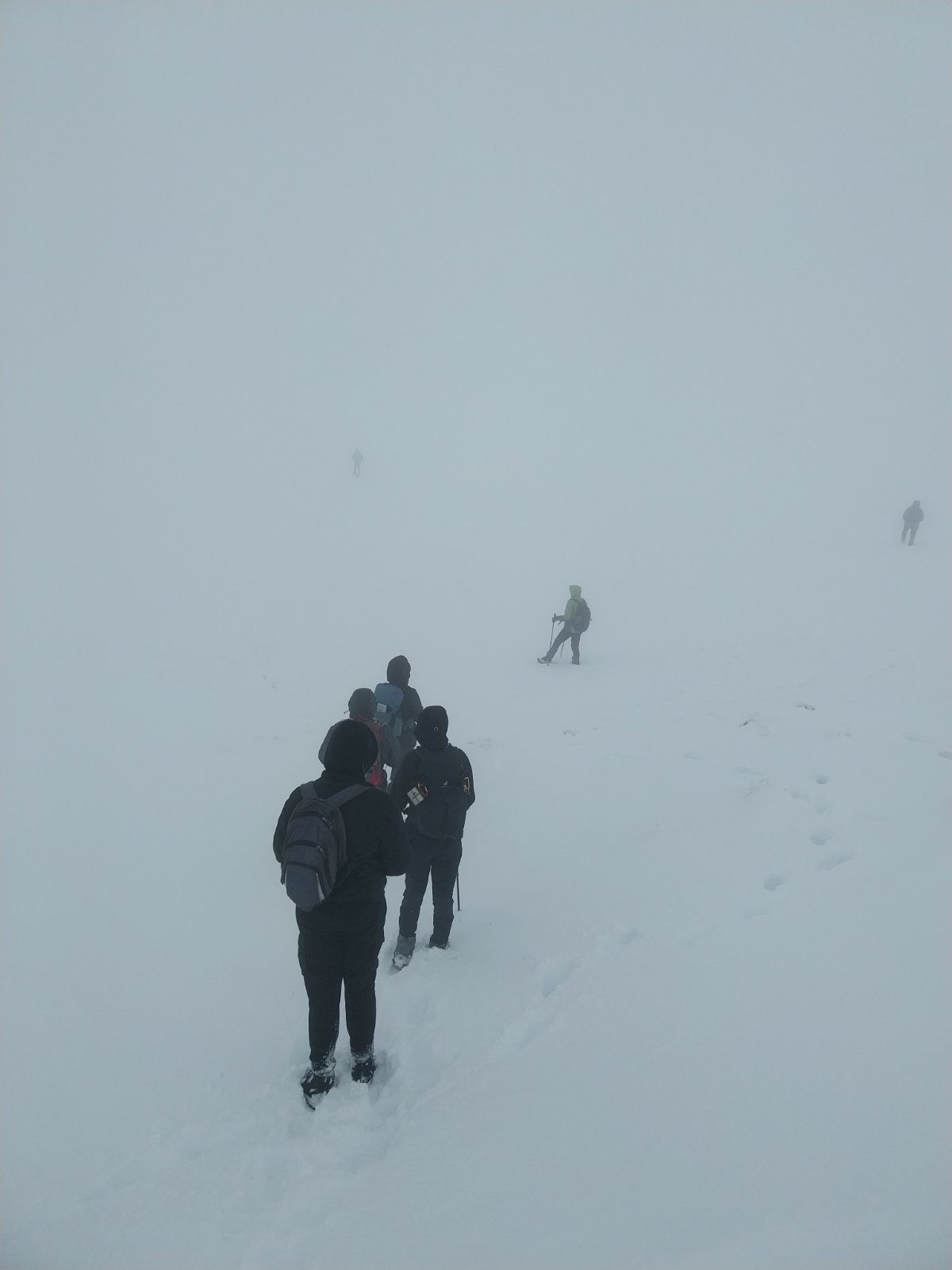 Na najizazovnijem dijelu uspona planinari su se susreli s potpunom bijelom izmaglicom bez vidljivog horizonta, u kojoj je bilo gotovo nemoguće procijeniti smjer. Uz pomoć mobilnih aplikacija i stalno praćenje stupova, koji su bili vidljivi tek na dvadesetak metara, grupa je polako, ali sigurno napredovala prema vrhu.
