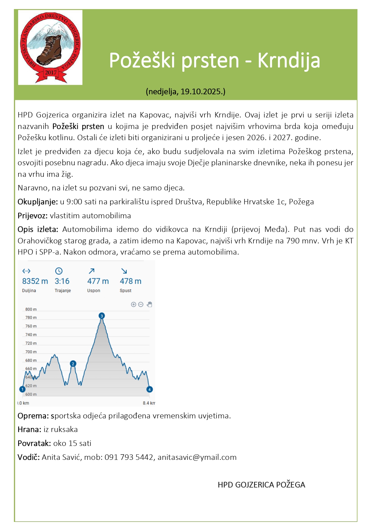POŽEGA / ORAHOVICA – Ove prekrasne sunčane nedjelje su se naši Gojzići, ali i oni veliki planinari zaputili na najviši vrh Krndije, Kapovac. Put nas je prvo vodio od prijevoja Međa do Orahovačkog starog grada. Većini sudionika izleta je ovo bio prvi posjet starom gradu. Za tu utvrdu se smatra da je starija i da je zauzimala veću površinu od Ružice grada. Vjeruje se da je nastala u ranom srednjem vijeku te da je služila u vojne svrhe.