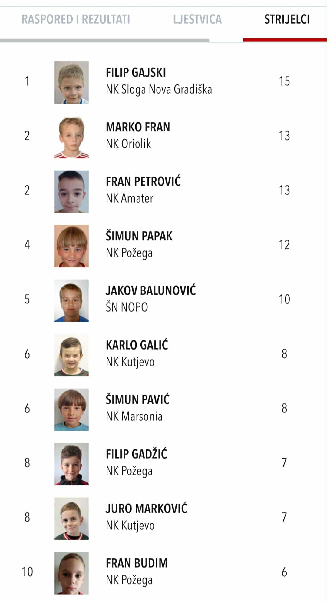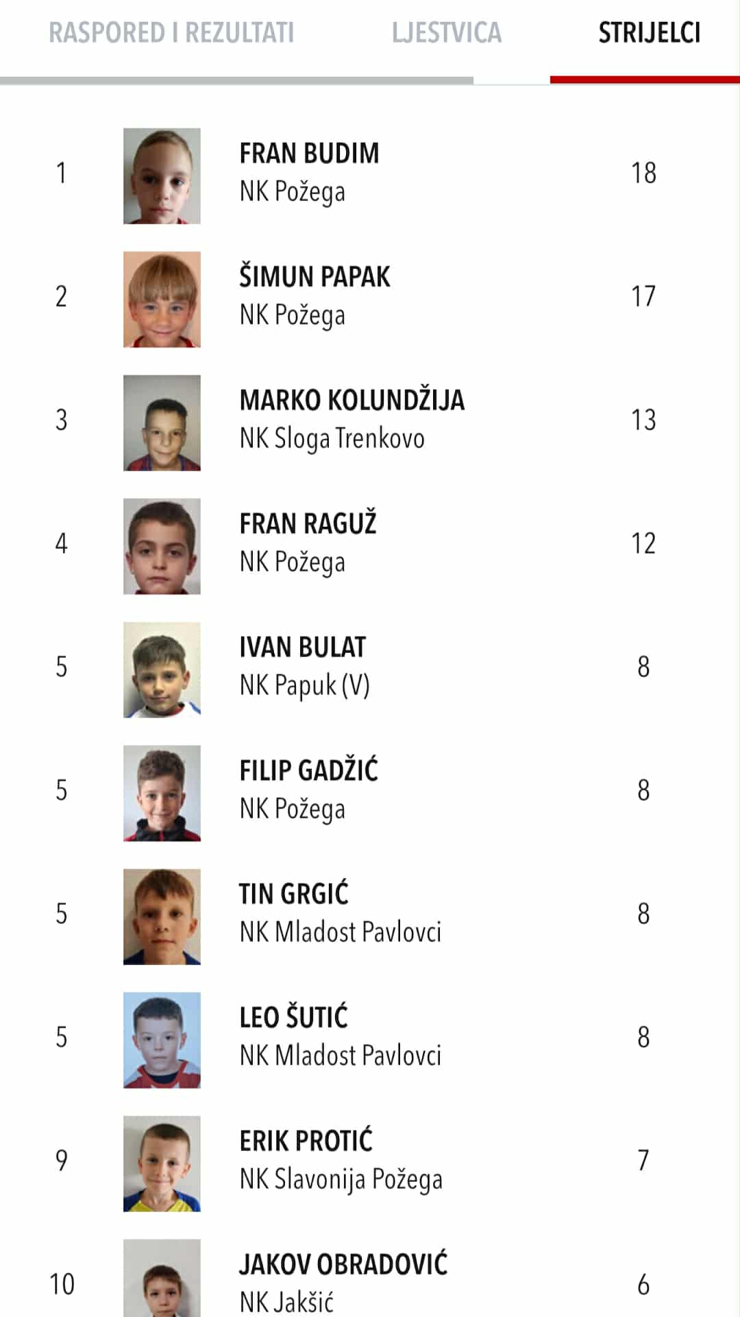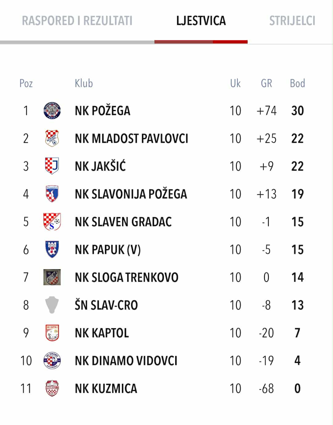 Sjajna generacija malih Požeginih nogometaša je tako osvojila jesenski naslov prvaka sa maksimalnih 30 bodova i gol razlikom 74:0, a niti jedan protivnik u 10 odigranih utakmica im nije uspio zatresti mrežu. Na 2. i 3. mjestu su Mladost (Pavlovci) i Jakšić sa 22 osvojena boda.
