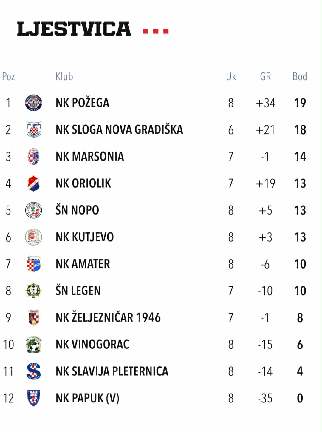 Požega je u ovom rangu trenutno na 1. mjestu sa 19 bodova (6 pobjeda, 1 remi, 1 poraz) i razlikom pogodaka 40:6. Na drugom mjestu je Sloga (Nova Gradiška) sa 18 bodova (6 pobjeda) i dvije utakmice manje. Upravo ove dvije najkvalitetnije ekipe igraju međusobno u narednom, 9. kolu. Igrači trenera Milana Krmara ugostit će Slogu u nedjelju, 02. 11. 2025. s početkom u 10,00 sati na igralištu NK Požega.