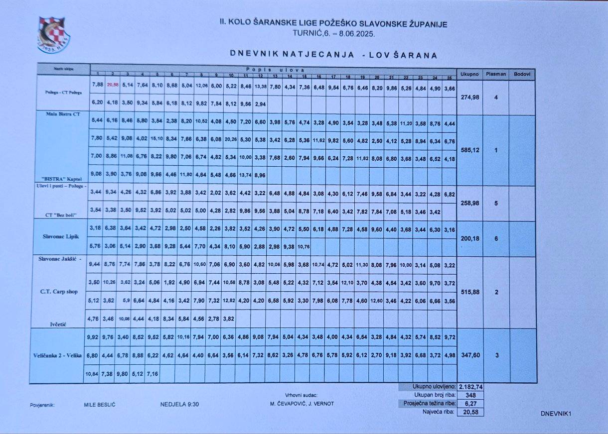 POŽEGA – U organizaciji Športskog ribolovnog društva Požega na jezeru Požega u prigradskom naselju Turnić na 2. kolu Županijske lige Športskog ribolovnog saveza Požeško-slavonske županije je od 06. do 08. lipnja 2025. ukupno šest natjecateljskih ekipa za 50 sati ribolova ulovilo je 348 komada šarana i amura ukupne težine 2.182,74 kilograma.