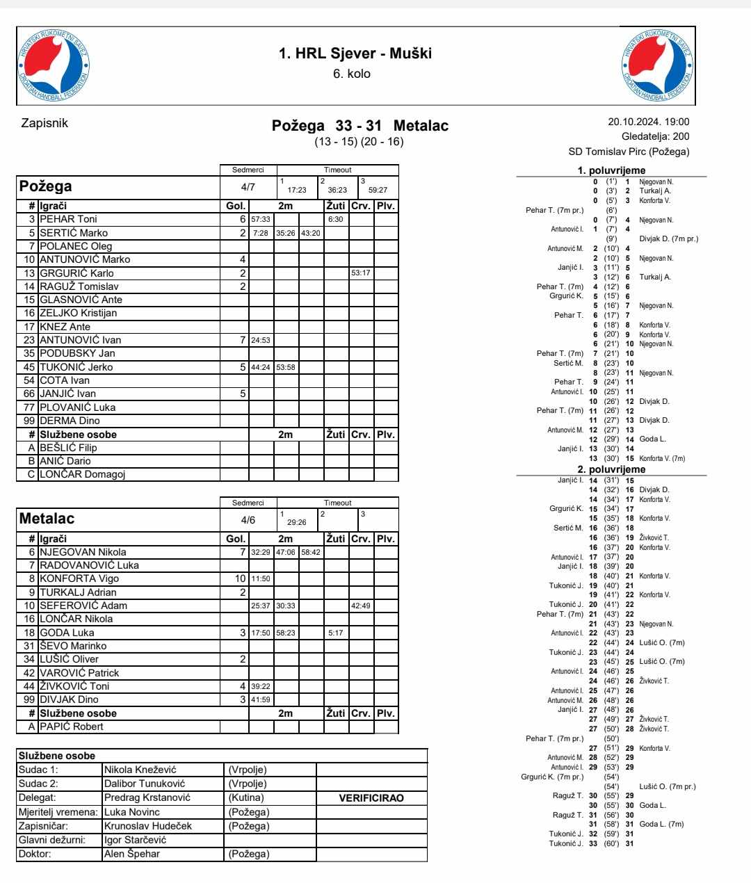 POŽEGA – Rukometaši Požege su u 6. kolu 1. Hrvatske rukometne lige – Sjever u Sportskoj dvorani Tomislav Pirc svladali Metalac (Zagreb) rezultatom 33:31 (13:15). Kad se “lomila” utakmica i kad su i sami igrači Požege počeli gubiti vjeru u preokret digla ih je publika s tribina Grabrika pa su zajedničkim snagama došli do uspjeha i proslave novih bodova.