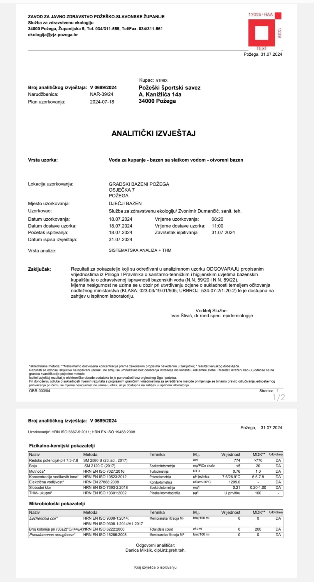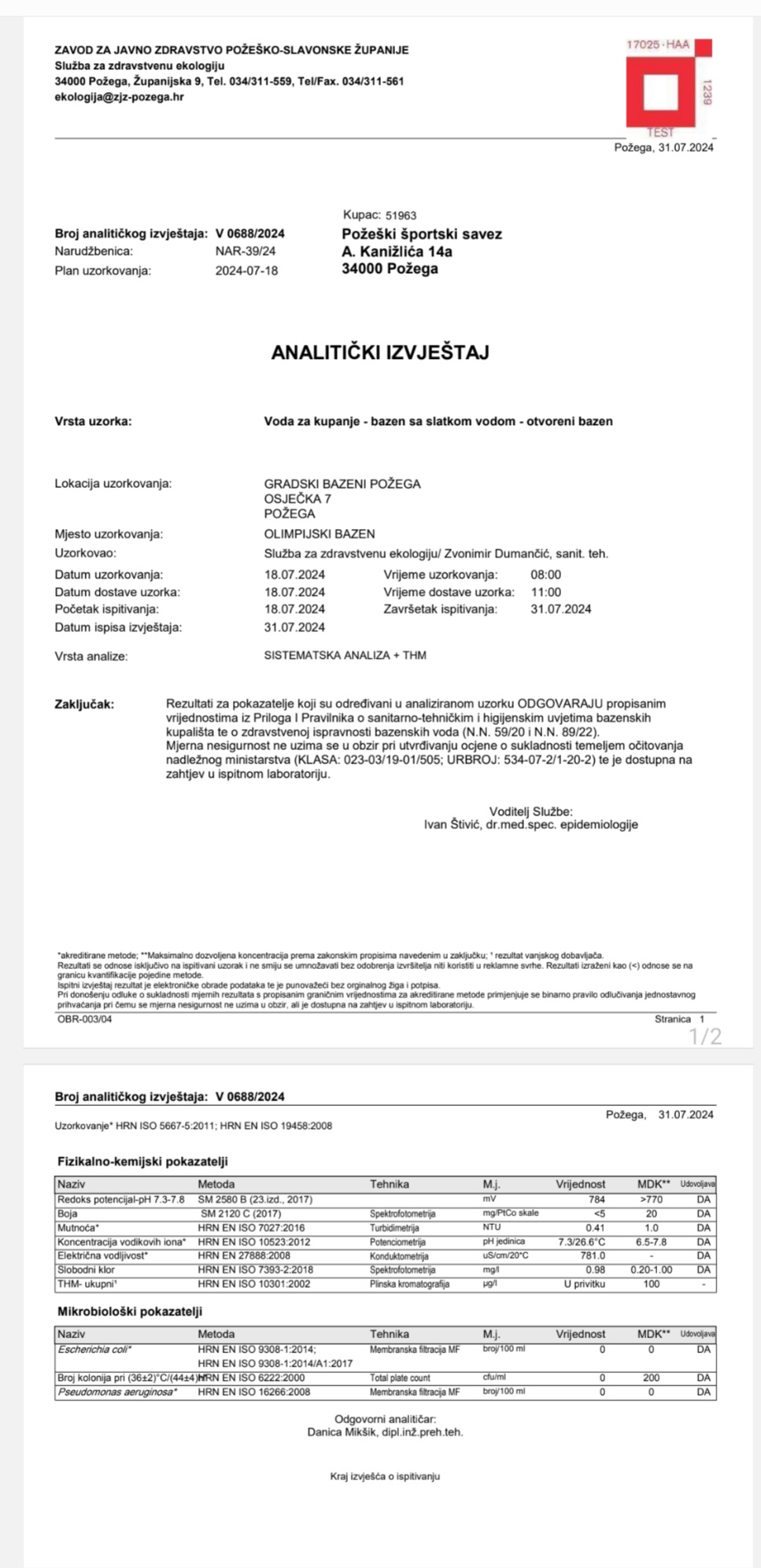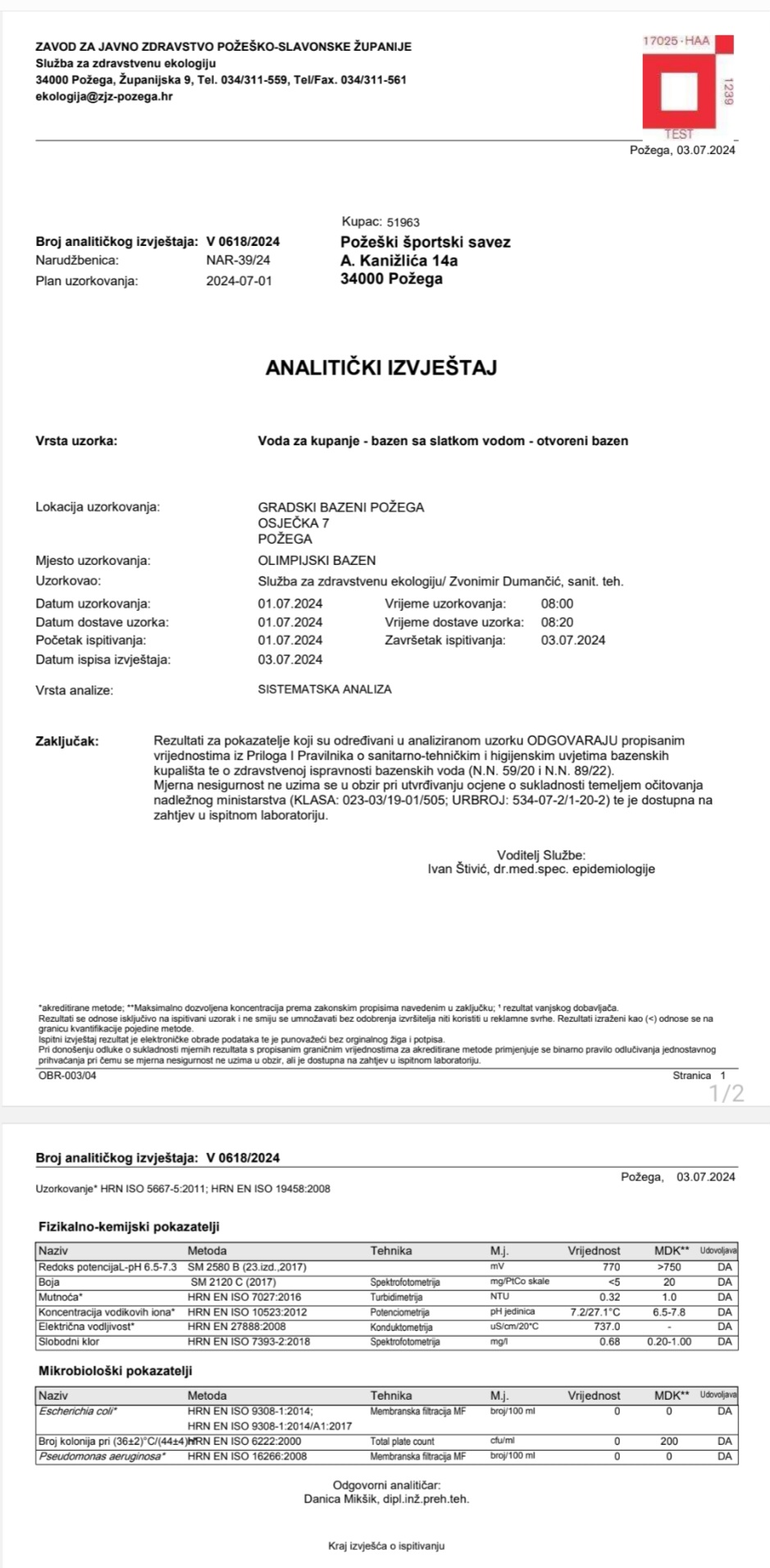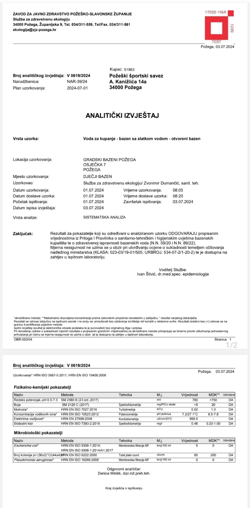 Prema Pravilniku o sanitarno-tehničkim i higijenskim uvjetima bazenskih kupališta te o zdravstvenoj ispravnosti bazenskih voda Zavod za javno zdravstvo Požeško-slavonske županije 2 puta mjesečno uzima uzorak vode i vrši analizu. Sve dosadašnje analize odgovaraju propisanim vrijednostima navedenog Pravilnika.