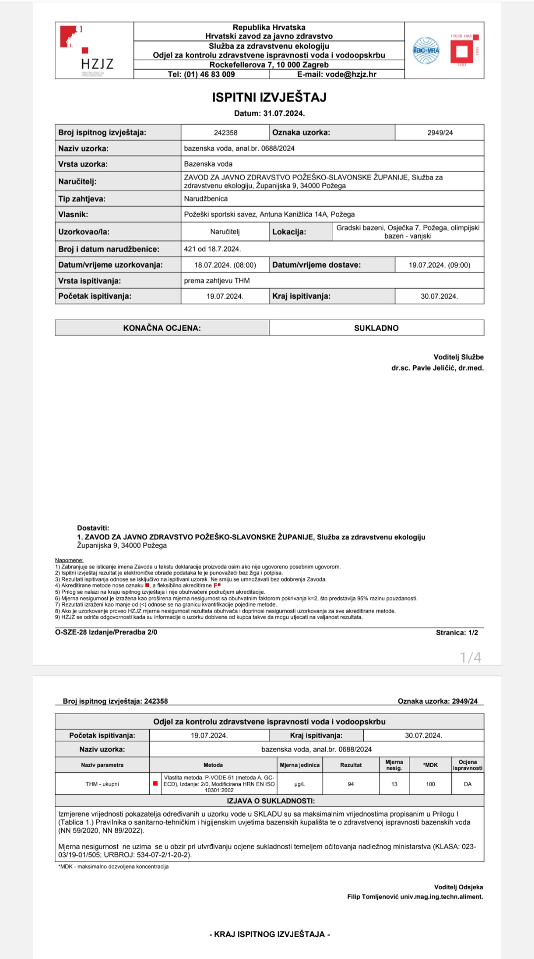 Posljednji uzorak vode uziman je 18. srpnja i također je ispravan, a već sutra se uzima novi nalaz.