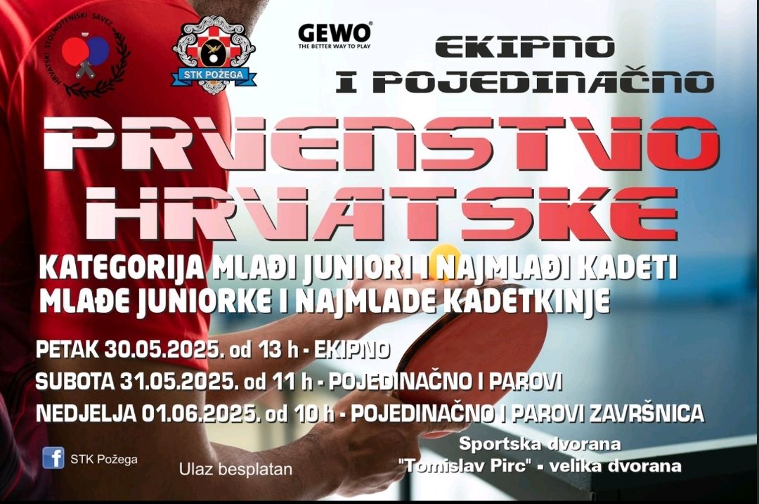 Prvenstvo Hrvatske u stolnom tenisu za mlađe kategorije održat će se od 30. svibnja do 01. lipnja 2025. u SD Tomislav Pirc