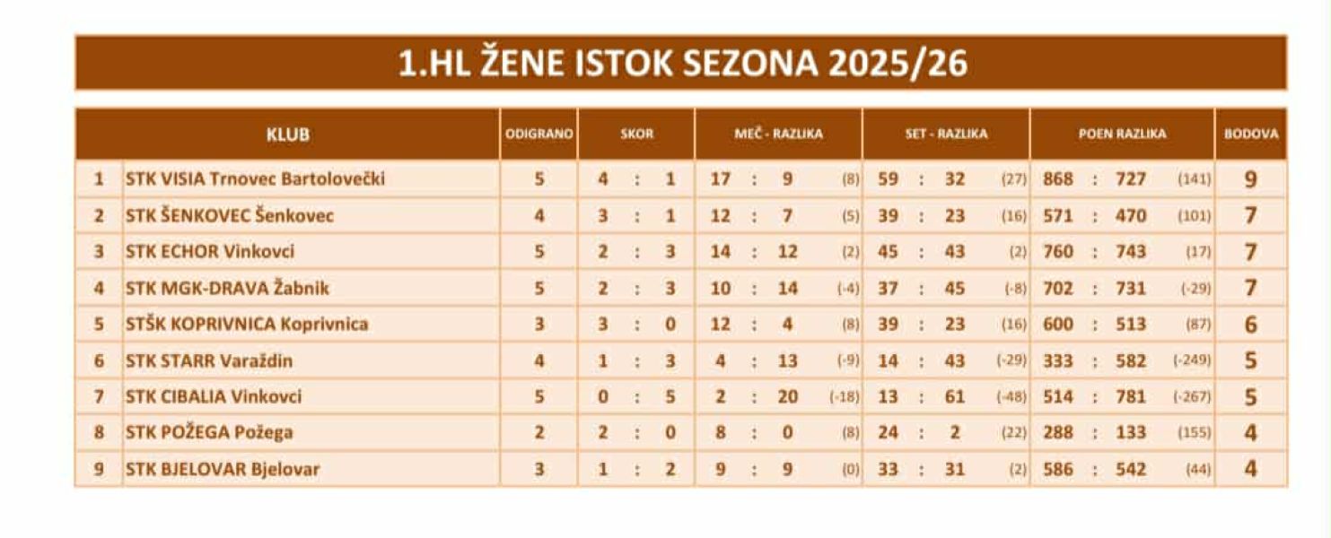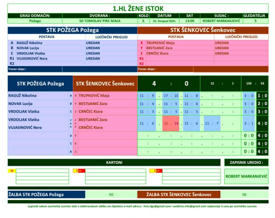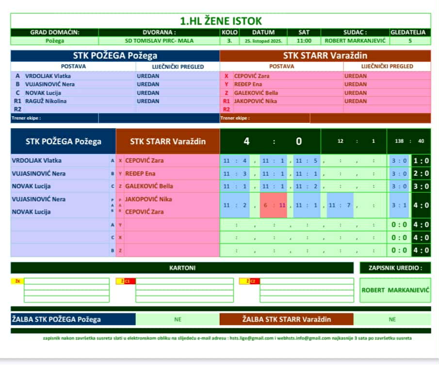 U narednom, 4. kolu požeške stolnotenisačice će gostovati u Vinkovcima, a protivnici će im u subotu, 15. 11. 2025. biti STK Echor (11 sati) i STK Cibalia (17,00 sati).