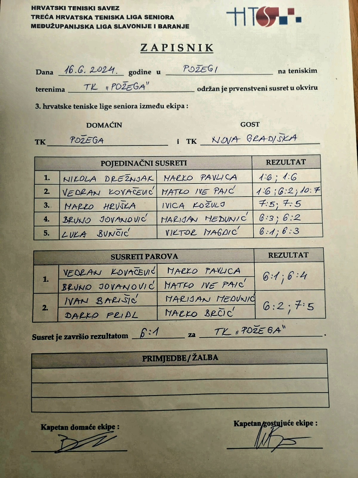 Seniorska ekipa TK Požege je u 6. kolu 3. Hrvatske teniske lige – Istok. pobijedila kod kuće vodeću ekipu TK Nova Gradiška rezultatom 6:1. U 6. kolu u Požegu dolazi TK Olimpija Osijek 1984 (22. 06.).